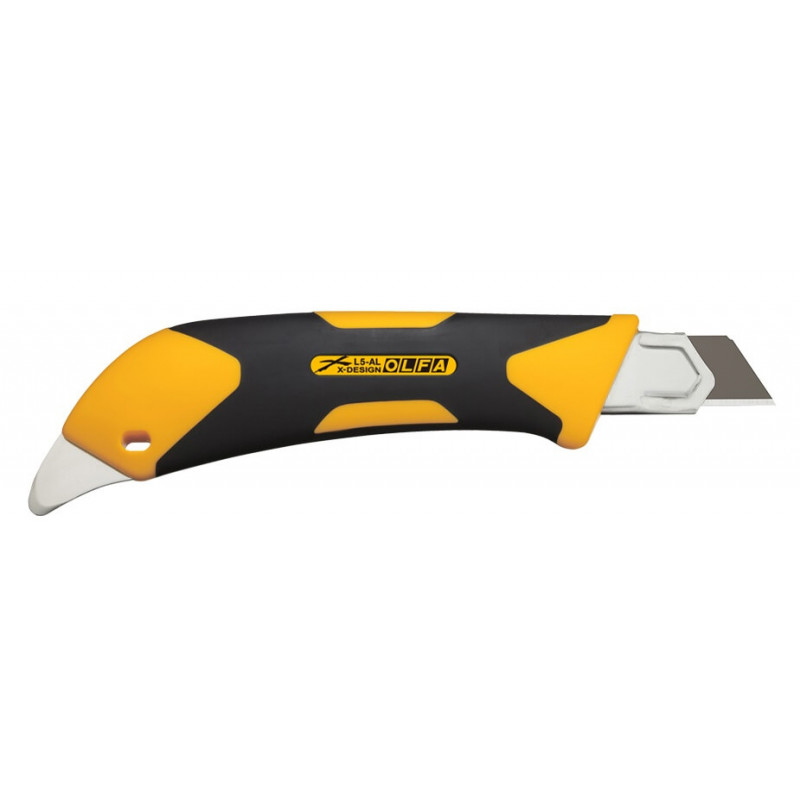 Cutter L5-AL cu lama de 18 mm din familia X Design, cea mai noua conceptie de la OLFA, cu carcasa din otel pentru lame, fixarea lamei se relizeaza cu parghie oscilanta.
