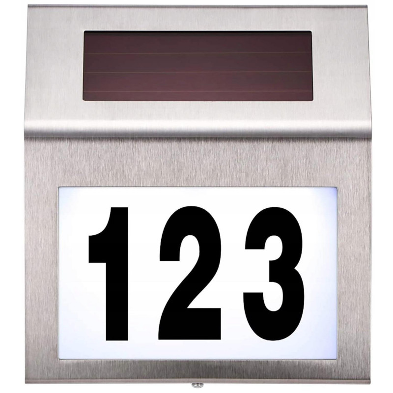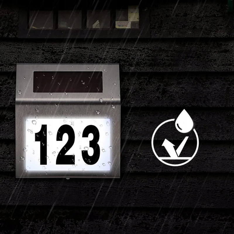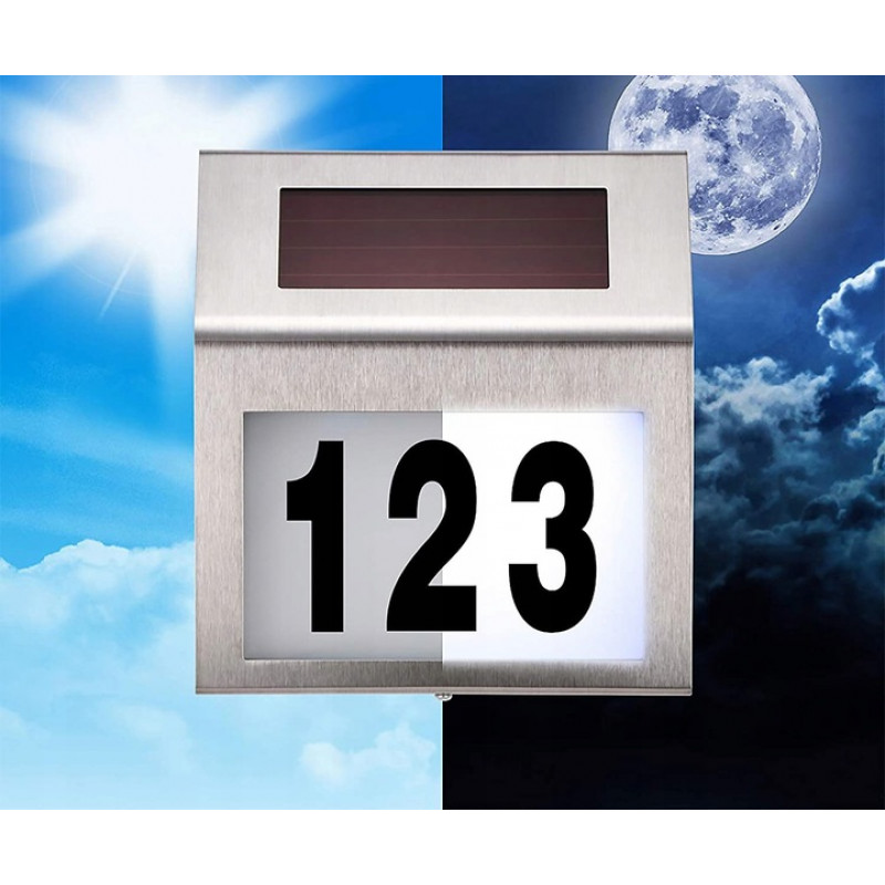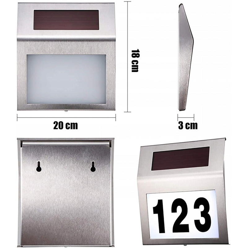 Set de litere: 1 foaie de la a la h Lampa se incarca in timpul zilei, depozitand energia electrica intr-o baterie reincarcabila (NI-MH 600 m Ah), iar dupa lasarea intunericului se aprinde automat pentru a ilumina numarul casei.