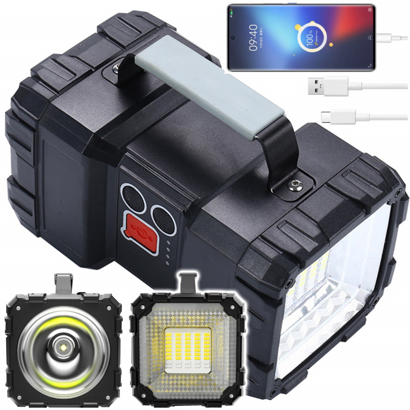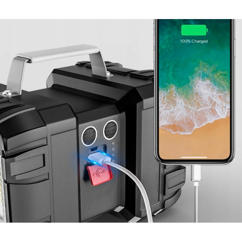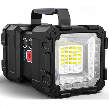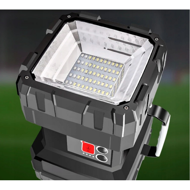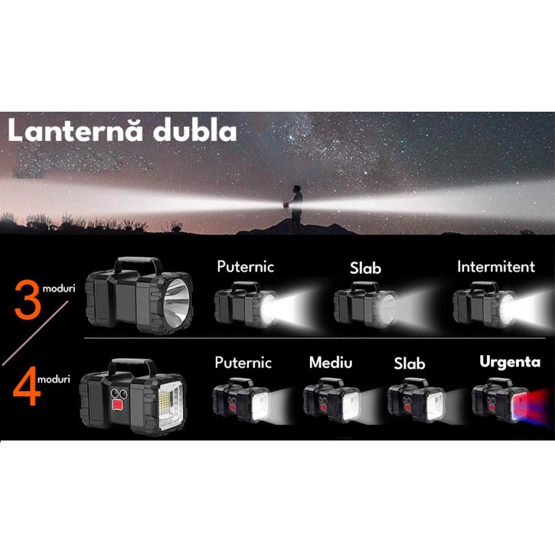 Cablu de incarcare USB inclus Lamapa solara functioneaza pe toate tipurile de vreme. Atat panoul cat si sursele de lumina sunt rezistente la ploaie, ninsoare si temperaturi extreme. Lanterna de mare putere cu functie powerbank. Dispozitivul este perfect pentru iluminarea zonelor de camping sau pentru urgente. Lumina de urgenta rosie/ albastra - In cazul in care aveti nevoie de ajutor in timpul unei aventuri in aer liber, aceasta lanterna multifunctionala are o functie speciala de iluminare in caz de urgenta. Lumina stroboscopica rosie si albastra asigura observarea semnalului de la distanta de catre alte persoane. Aceasta lanterna cu LED-uri reincarcabila ofera 3+4 moduri de iluminare, astfel incat ambele capete pot comuta cu usurinta intre cele trei moduri de luminozitate slaba-mediu-forte cu un singur clic. In plus, lumina de urgenta, luminile stroboscopice rosii / albastre si modul SOS pot fi folosite pentru ajutor in aer liber. Cu o luminozitate de pana la 800 lm, aceasta lanterna reincarcabila este potrivita pentru camping, explorarea drumurilor si munca de noapte. Este echipata cu baterii care asigura pana la 10-20 de ore de utilizare, astfel incat va puteti bucura de o noapte in aer liber fara griji. Lanterna va permite sa va incarcati aparatul foto, telefonul, notebook-ul si alte dispozitive in timp ce sunteti in miscare.