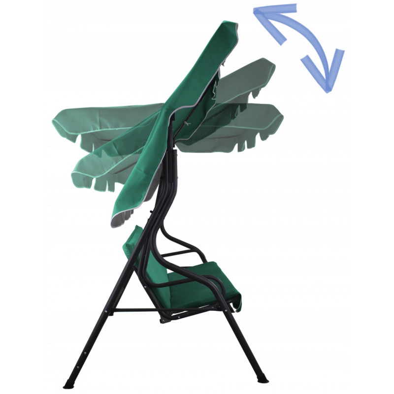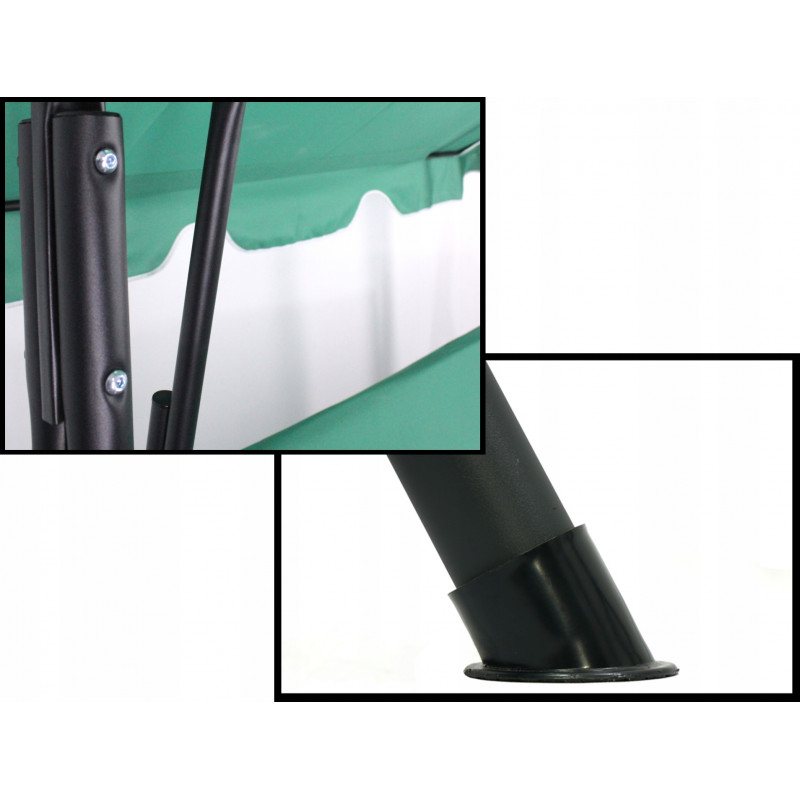 Dimensiunile baldachinului: 165 x 113 cm Banca este formata dintr-o structura metalica pe care este intins un material durabil. Perna detasabila, care este formata dintr-un sezut si un spatar, are carlige pentru a preveni alunecarea acesteia. Finisat cu volan va adauga cu siguranta farmec oricarei gradini si terase. In interiorul pachetului veti gasi
