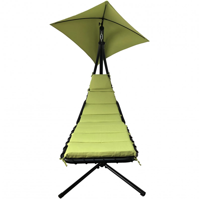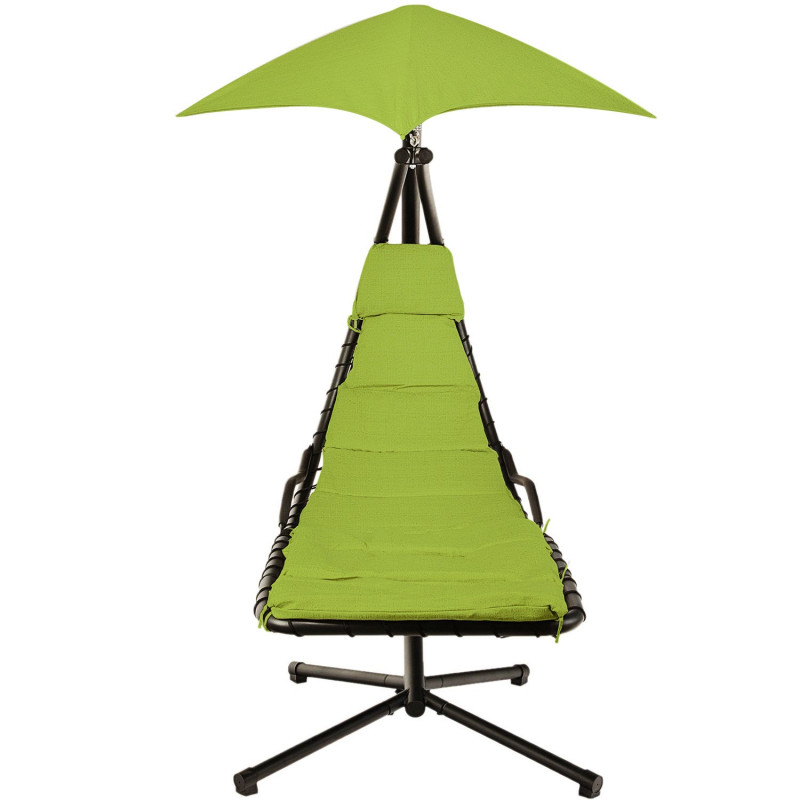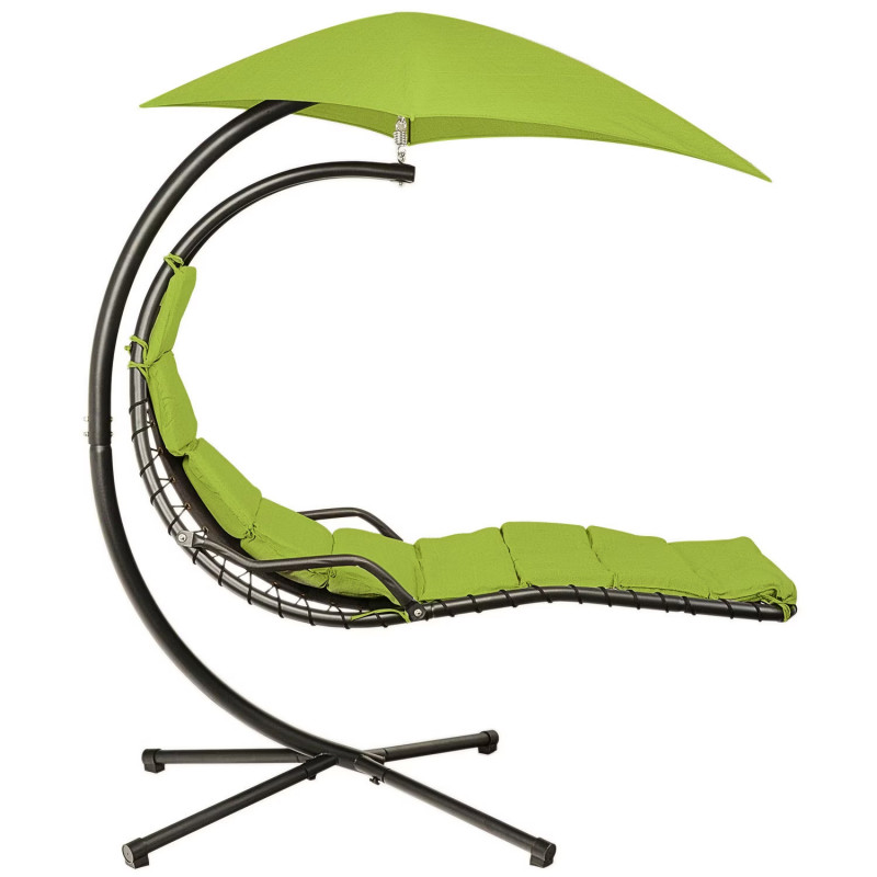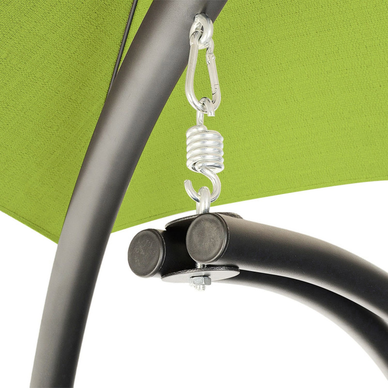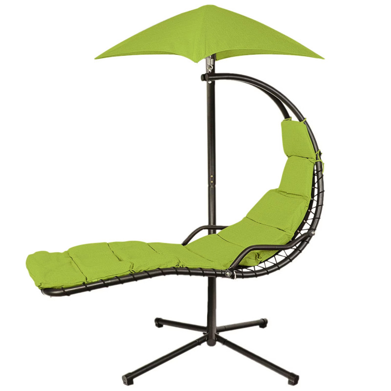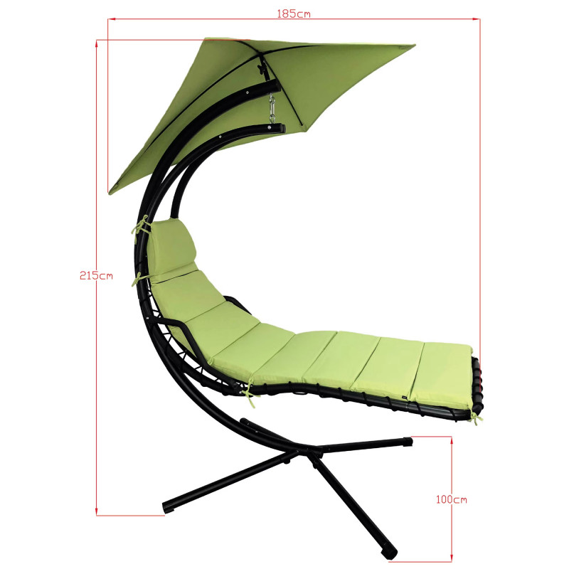 Scaunul suspendat perfect pentru terasa sau balcon, este o piesa eleganta si confortabila care adauga un aer relaxant spatiului tau exterior. Cu o dimensiune de 190 x 100 x 220 cm, acest scaun suspendat ofera un loc placut pentru a te relaxa si a te bucura de aerul proaspat in timpul zilelor frumoase de vara.Cadru din otel negru de inalta rezistenta asigura stabilitatea si durabilitatea scaunului. Acesta este construit din tevi de otel rezistente, care ofera o sustinere solida si sigura. Cu toate ca are o structura robusta, scaunul suspendat ramane usor de mutat si de amplasat in diferite locuri, datorita designului sau portabil. Scaunul suspendat este insotit de perne verzi care ofera un plus de confort si sprijin. Aceste perne sunt concepute pentru a se potrivi perfect formei corpului tau, permitandu-ti sa te relaxezi intr-o pozitie confortabila si sa te bucuri de momentele de relaxare in aer liber.Greutate maxima suportata: 120 kg