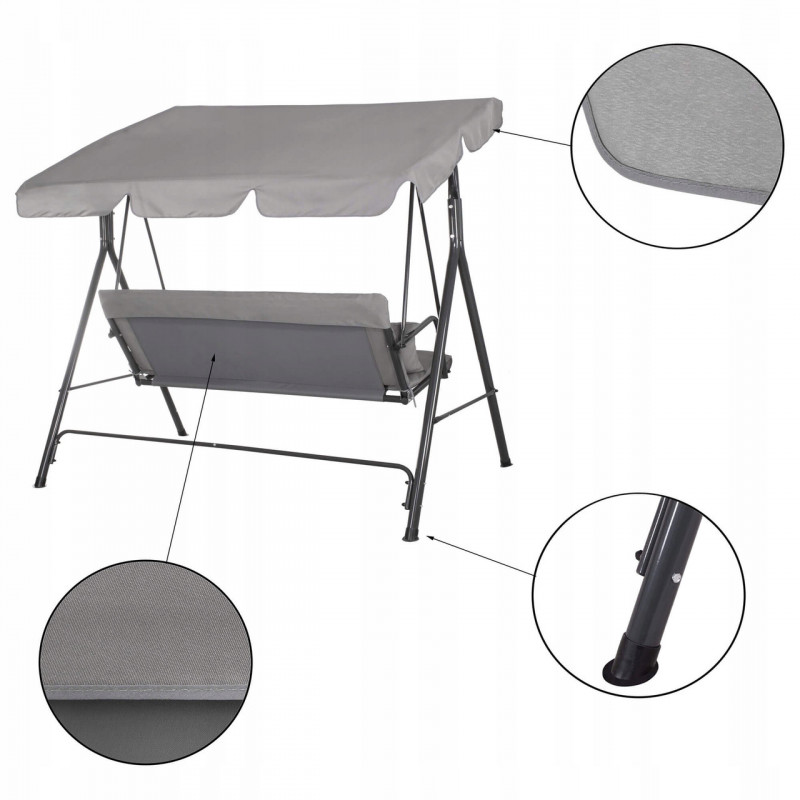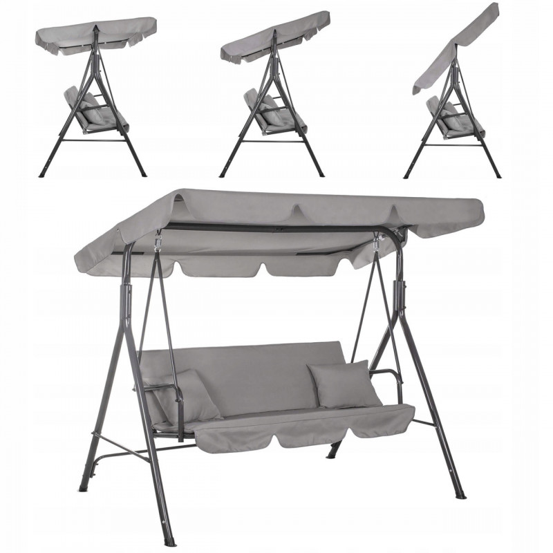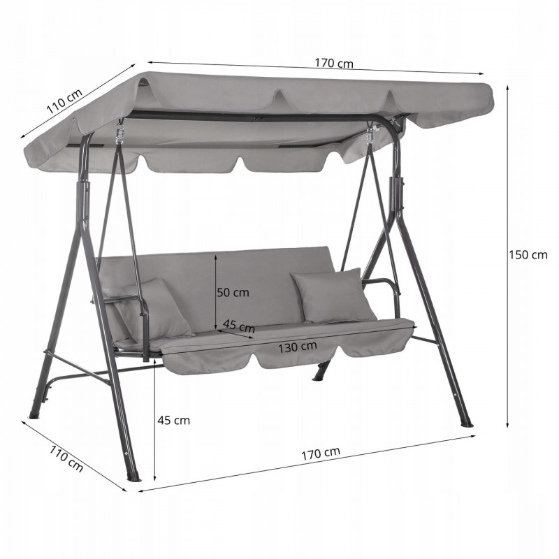 Balansoar gradina, 3 locuri, gri deschis, 170x110x150 cm, Luna Balansoarul de 3 persoane este un accesoriu esential pentru toate terasele si gradinile.Este potrivit pentru terasa, balcon, plaja si gradina.Are un design modern, cu o structura metalica stabila si este perfect rezistent la intemperii. Balansoarul include 2 perne usor de curatat. In plus, pachetul include toate suruburile si accesoriile necesare cu