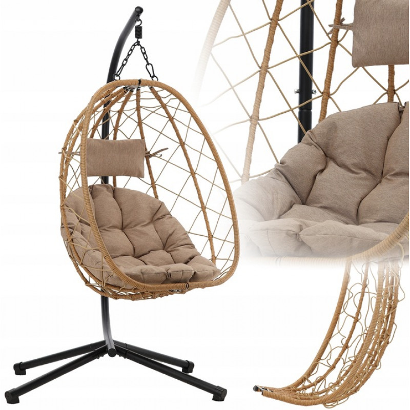 Scurta descriere Fotoliul suspendat pliabil este alegerea ideala pentru relaxare in aer liber sau in interior. Construit pe un cadru metalic stabil, cu cos din ratan sintetic si perna confortabila inclusa, acest fotoliu ofera echilibrul perfect intre estetica si functionalitate. Designul pliabil permite o depozitare usoara, fiind perfect atat pentru acasa, cat si pentru transport.