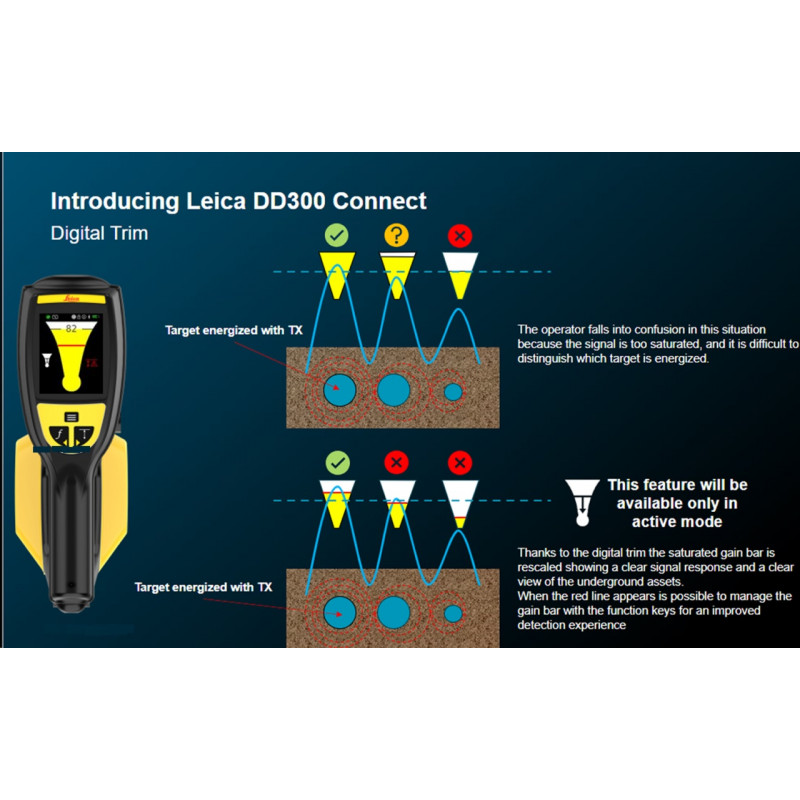 Fiabilitate - Noul Leica DD300 se mândrește cu un trim digital inovator, pentru a oferi o detectare precisă chiar și în medii cu mai multe ținte. Acceptă o gamă largă de frecvențe de transmisie. Pe lângă gama standard de frecvențe. Leica DD300 este singurul localizator de cablu de pe piața de evitare care acceptă frecvența de 83 kHz, pentru a ajuta utilizatorii în detectarea structurilor subterane chiar și în scenarii mai complexe.