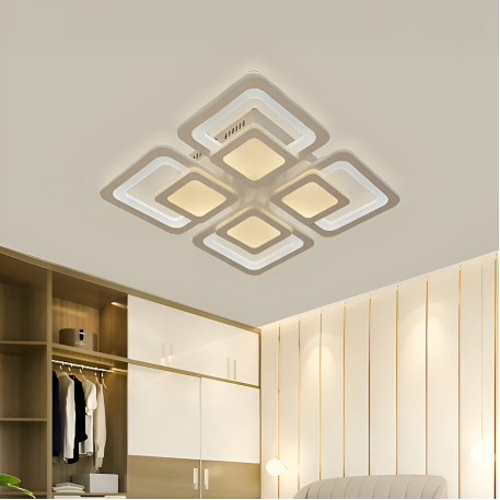 Lustra LED cu telecomanda SUSAN, 77W, iti ofera control complet asupra luminii din casa. Design geometric cu patru patrate, finisaj alb mat, materiale solide: metal si acril. Ai trei tipuri de lumina (rece, calda, neutra), toate reglabile din telecomanda - ajustezi intensitatea si temperatura de culoare cum vrei. Se poate schimba tipul de lumina si din intrerupatorul clasic, prin apasari succesive. Flux luminos puternic, 6160 lm, suficient pentru camere mari. Consum redus, durata de viata 25.000 ore. Merge in living, dormitor, bucatarie sau birou.
