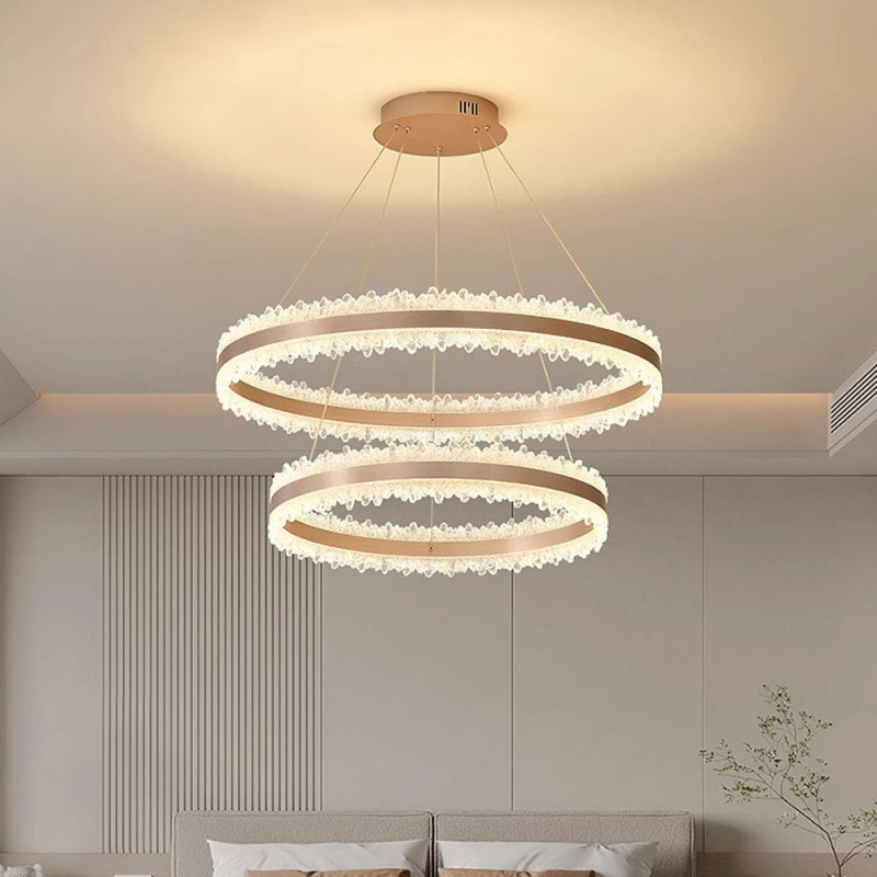 Aceasta lustra LED cu telecomanda are doua cercuri suspendate si o putere totala de 126W, oferind o iluminare eficienta, potrivita pentru incaperi precum livingul, bucataria sau zona de dining. Cu un flux luminos de 10.080 lumeni, asigura lumina suficienta chiar si pentru spatii mai mari. Temperatura poate fi ajustata in 3 trepte (calda 3000K, neutra 4000K, rece 6000K), iar intensitatea este dimabila. Controlul se face atat din telecomanda, cat si de la intrerupatorul clasic. Functioneaza cu banda LED, are autonomie de 25.000 ore si se monteaza pe tavan. Finisajul auriu si forma rotunda o recomanda pentru cei care cauta o lustra LED pentru living sau pentru spatii comune cu volum mare.
