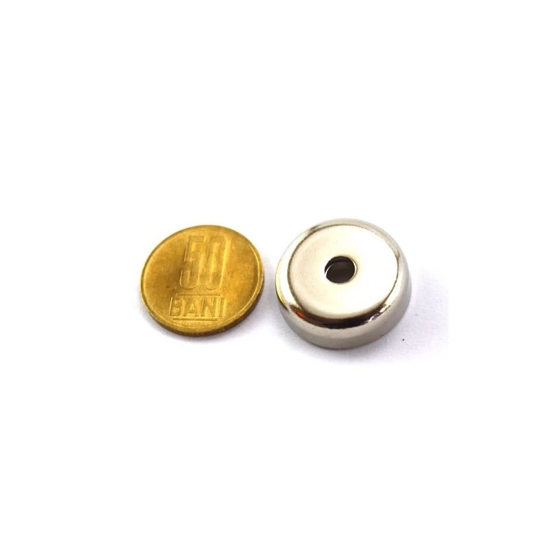 Magnet neodim puternic, formă oală, placat cu nichel cu diametrul 25 mm și forță aproximativ 15 kg la contact. Magnet oală, prevăzut cu gaură pe mijloc potrivită pentru fixare cu șuruburi cu cap înecat.