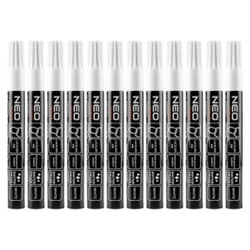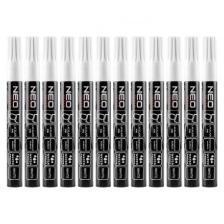 Marker pentru constructii, alb, permanent, rezistent la apa, lac, aluminiu 13-865 de la NEO TOOLS este un set de 12 markere robuste si durabile pentru piata constructiilor, cu varf rotund. Markerul este caracterizat de cerneala alba permanenta. Acesta este pe baza de lac, se usuca rapid si este rezistent la apa. Carcasa sa este fabricata din aluminiu, impiedicand uscarea cernelii. Acest marker NEO TOOLS este recomandat pentru utilizarea pe diverse suprafete, cum ar fi metal, sticla, piatra, lemn, plastic.