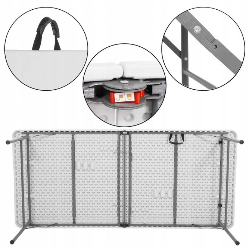 Material de blat usor de curatat Partea superioara a mesei turistice este groasa , masiva si are marginile rotunjite . Fabricat din materiale de cea mai buna calitate, garanteaza o capacitate de incarcare de pana la 150 kg. Merita subliniat faptul ca materialul HDPE special selectat pentru blat este rezistent la conditiile meteorologice in schimbare. Pentru a asigura siguranta maxima, masa este echipata cu incuietoare. Datorita acestui fapt, dupa desfacerea mesei, nu trebuie sa va faceti griji cu privire la stabilitatea produsului. Masa de catering poate fi pliata la dimensiunea unei valize. In plus, are un maner care il face usor de transportat in orice loc ales. Datorita acestui lucru, puteti muta cu usurinta masa si o puteti instala rapid la locul dorit.