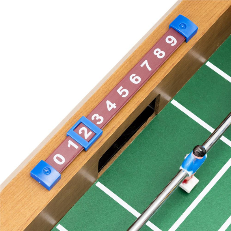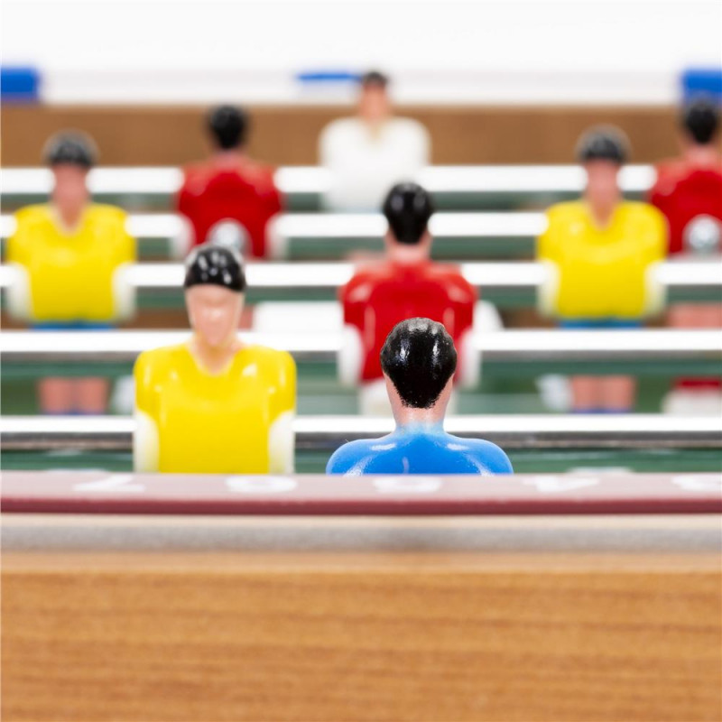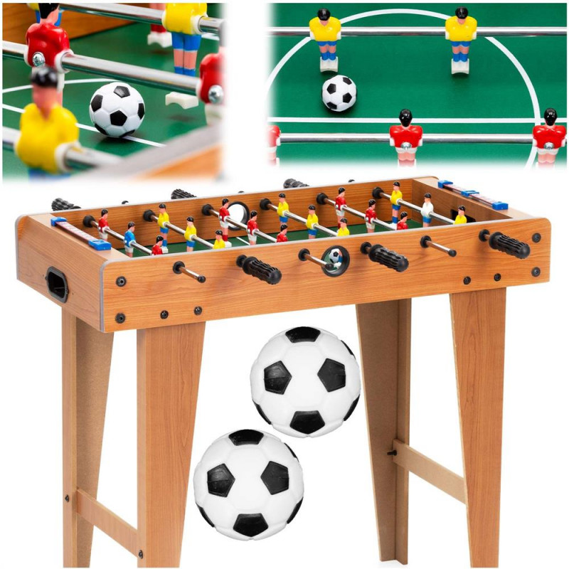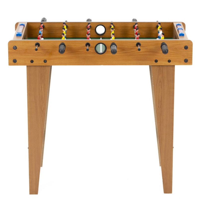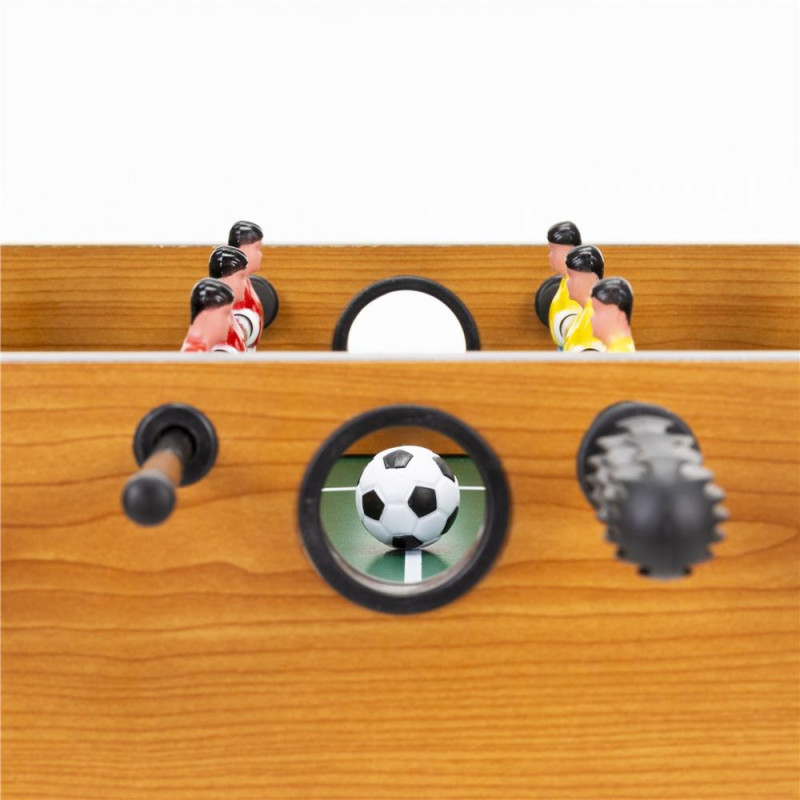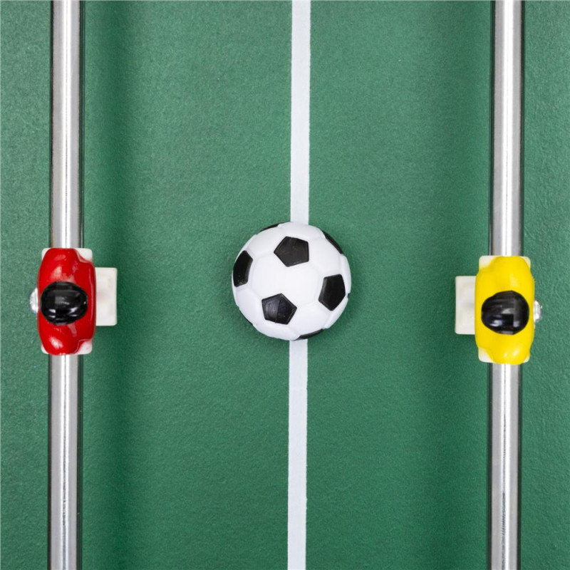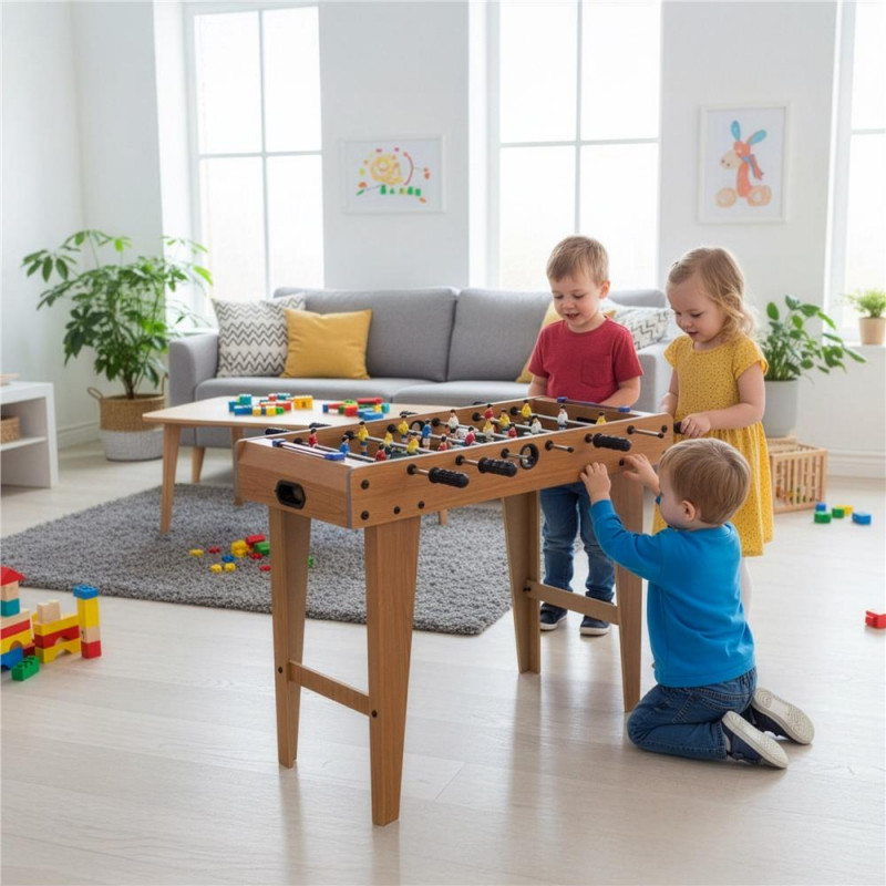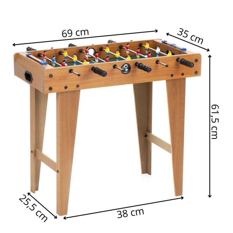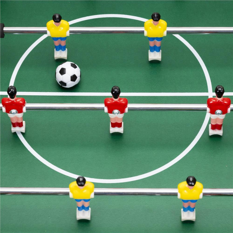 Scurta descriere Masa de fotbal pentru copii, conceputa pentru jocuri dinamice si distractie in familie. Structura realizata din MDF, cu bare metalice si jucatori din plastic rezistent, ofera stabilitate si durabilitate. Masa este prevazuta cu sistem de punctaj pentru ambele echipe si orificii laterale pentru introducerea mingilor. Manerele antiderapante asigura control bun in timpul jocului. Produs livrat pentru asamblare individuala, cu