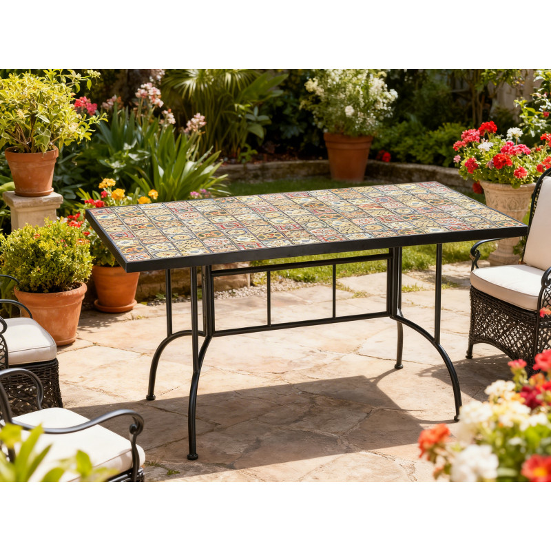 Scurta descriere: Masa de gradina cu blat mozaic aduce un plus de eleganta si stil spatiului exterior. Ideala pentru mese in aer liber sau momente de relaxare, ofera atat functionalitate, cat si un design decorativ deosebit.