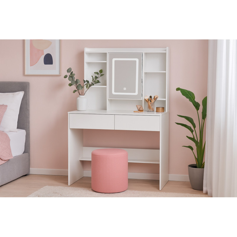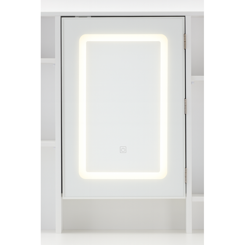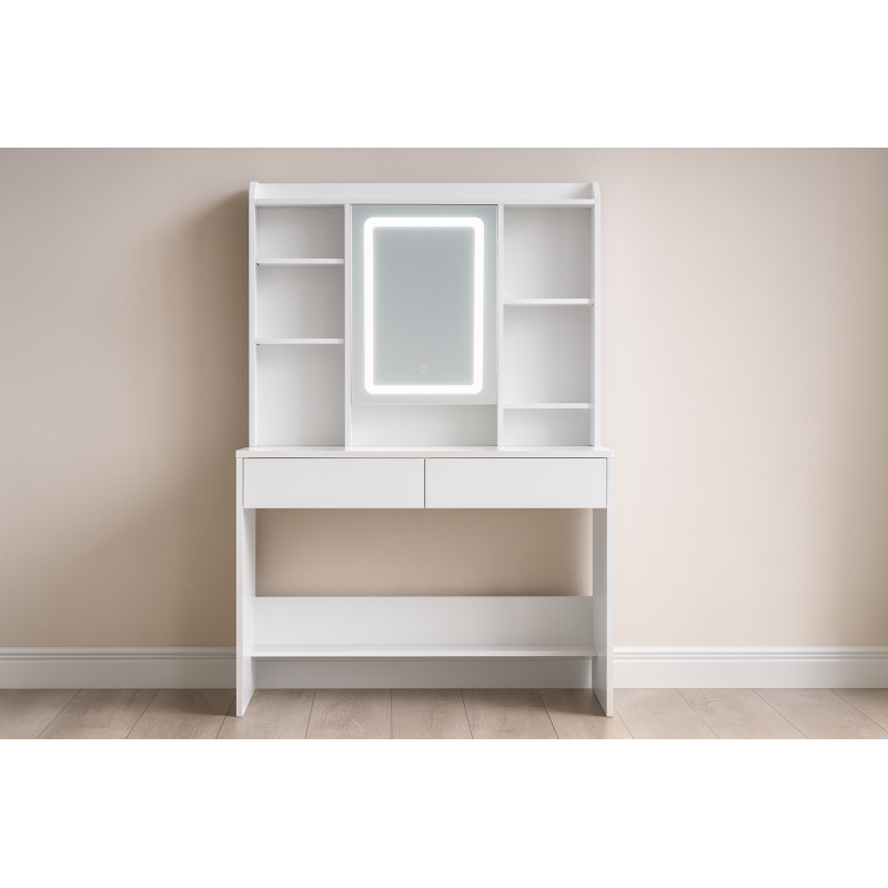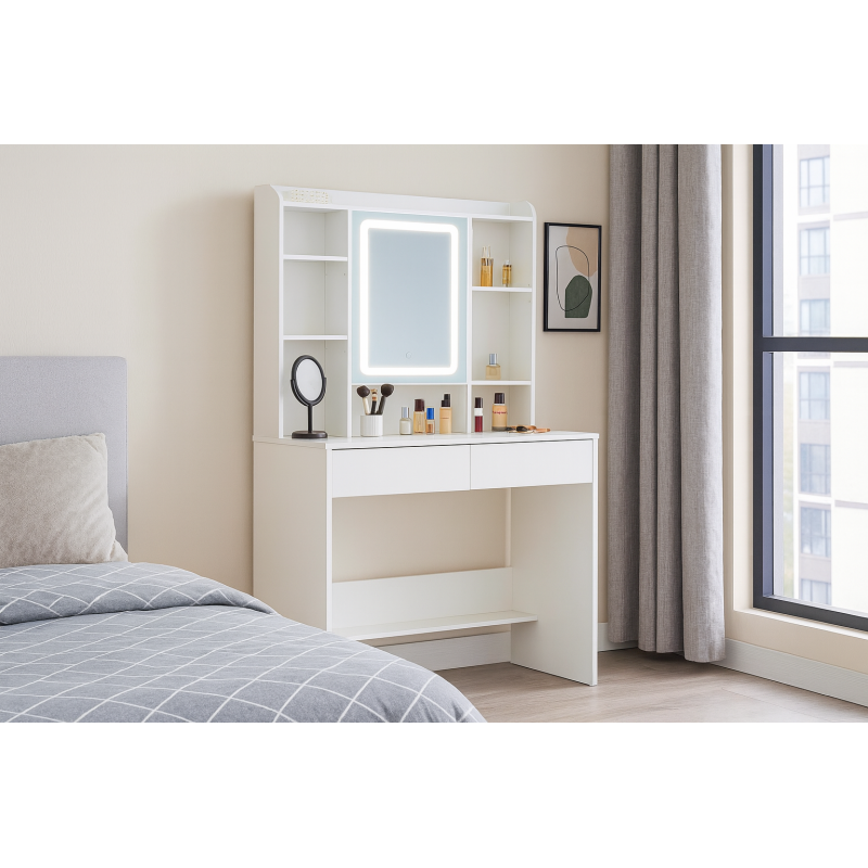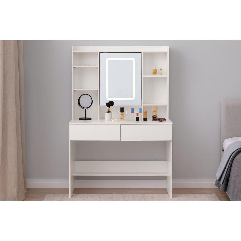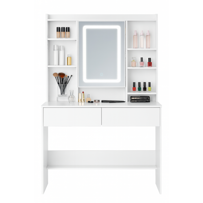 Scurta descriere Masuta cosmetica este ideala pentru machiaj si ingrijire, oferind un spatiu bine organizat si iluminare LED reglabila. Oglinda rabatabila permite acces la compartimentul interior pentru bijuterii, iar rafturile si sertarele asigura depozitare eficienta. Designul modern si materialul MDF ofera eleganta si functionalitate in dormitor sau dressing.