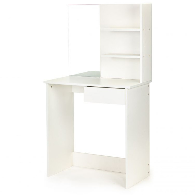 Scurta descriere: Aceasta toaleta de machiaj moderna este ideala pentru dormitor sau dressing, oferind un spatiu generos pentru organizarea produselor cosmetice si a bijuteriilor. Oglinda mare si rafturile laterale asigura confort si acces rapid la cele mai folosite accesorii. Sertarul incapator permite pastrarea in ordine a tuturor obiectelor de machiaj.