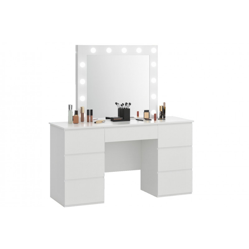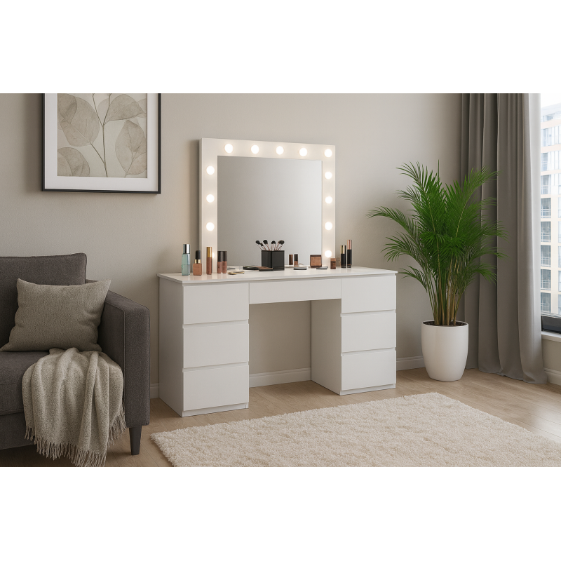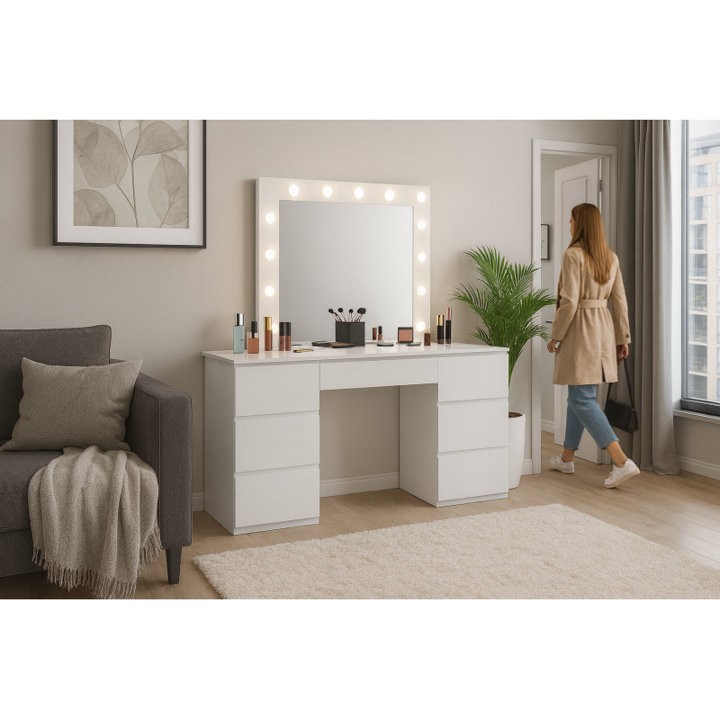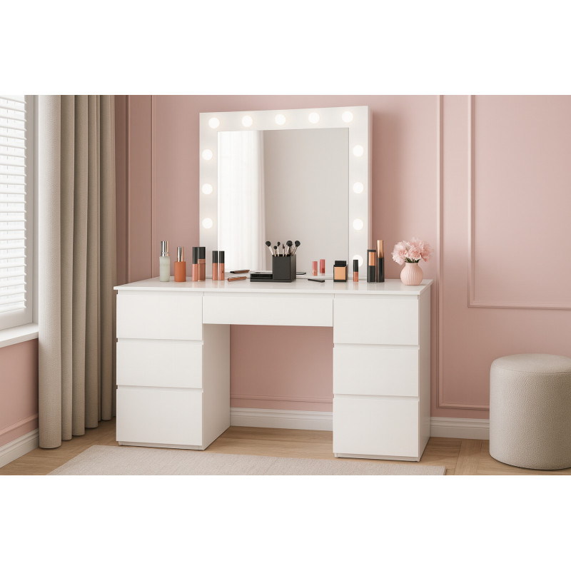 Oglinda LED de mari dimensiuni ofera vizibilitate excelenta pentru machiaj si coafura, indiferent de momentul zilei. Cele 7 sertare spatioase sunt ideale pentru depozitarea ordonata a cosmeticelor, accesoriilor si bijuteriilor. Designul modern si luminos, cu finisaj alb, adauga eleganta si prospetime oricarui interior. Constructia este stabila si rezistenta, realizata din materiale durabile pentru o utilizare indelungata. Montajul este facil, iar masa de toaleta poate fi folosita imediat, alimentatorul LED fiind inclus in pachet.