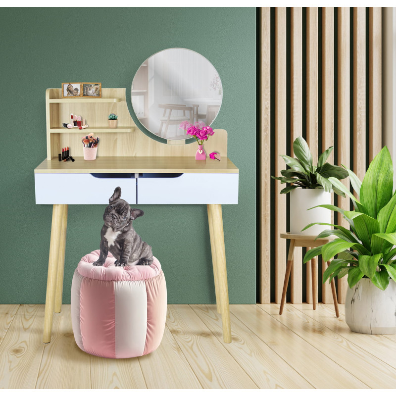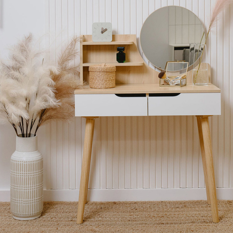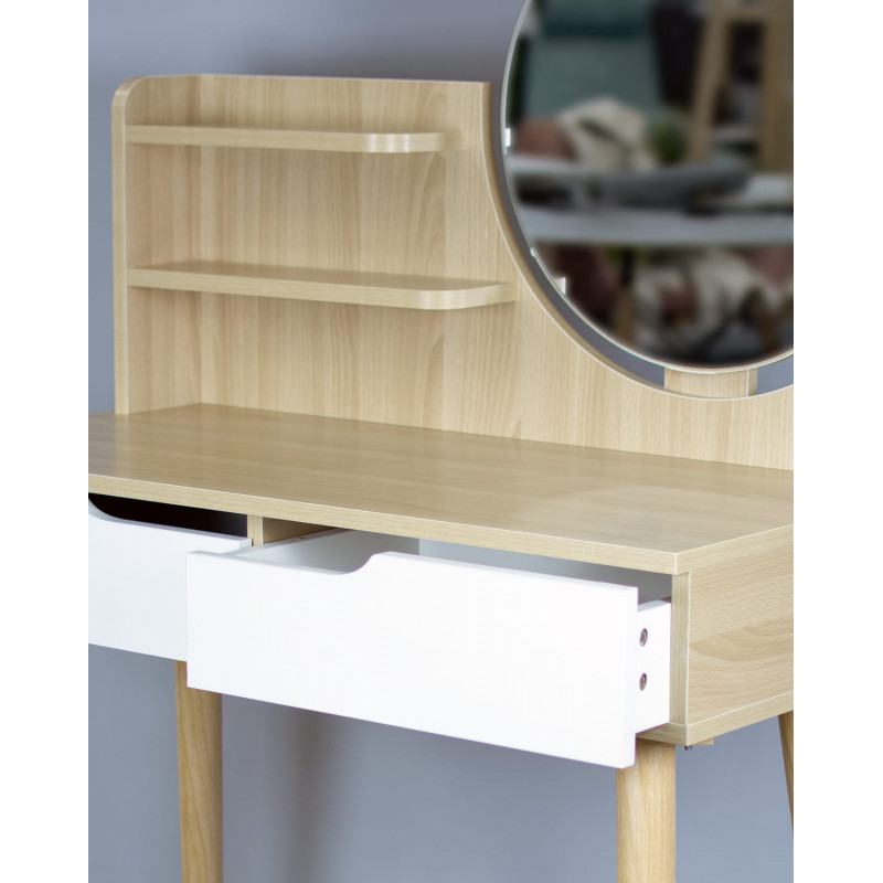 Aceasta piesa de mobilier este perfecta pentru dormitor, fiind un loc practic pentru machiaj, coafura, ingrijirea zilnica a frumusetii, precum si pentru a scrie o scrisoare sau pentru a depozita o varietate de obiecte mici. UTILIZARE OPTIMA SI PRACTICA - sertare, ideale pentru cosmetice, bijuterii, chitante, instrumente de scris si orice obiecte mici care vor avea in sfarsit locul lor,- rafturi convenabile pentru a tine obiectele folosite zilnic, cum ar fi crema de maini, un recipient de perii pentru pudra, parfum si accesorii pentru par,- o suprafata de lucru care va permite, de asemenea, sa folositi masuta de toaleta ca birou,- o oglinda, astfel incat sa va puteti vedea coafura si machiajul in detaliu din toate partile,- o zona de depozitare convenabila pentru taburete SPECIFICATIILE PRODUSULUI Material Tabla MDFCuloare alb, fag Inaltimea mobilierului 122 cm Latimea mobilierului 80 cm Adancimea mobilierului 40 cm Diametrul oglinzii 40 cm Asamblare Pentru autoasamblare *Articolele prezentate in imagine (bijuterii, cosmetice) nu fac parte din masa de toaleta.