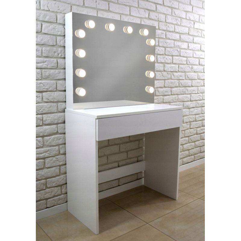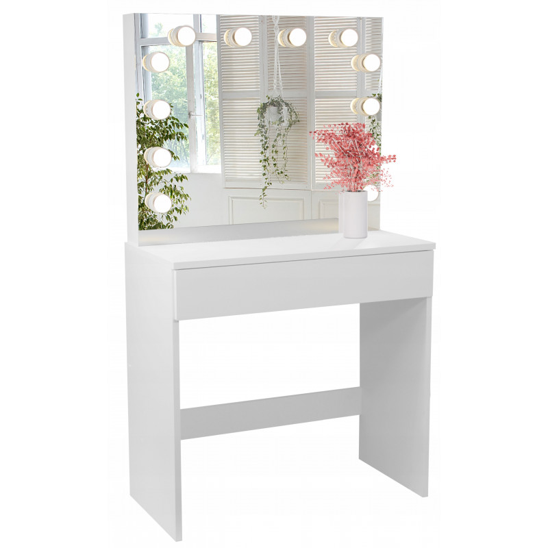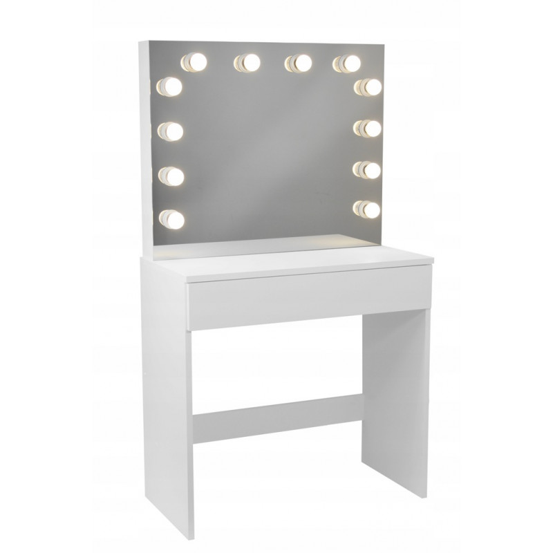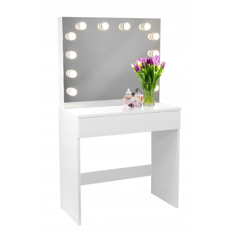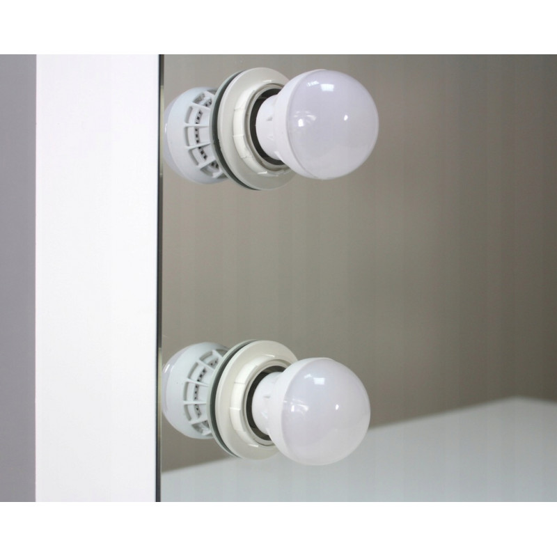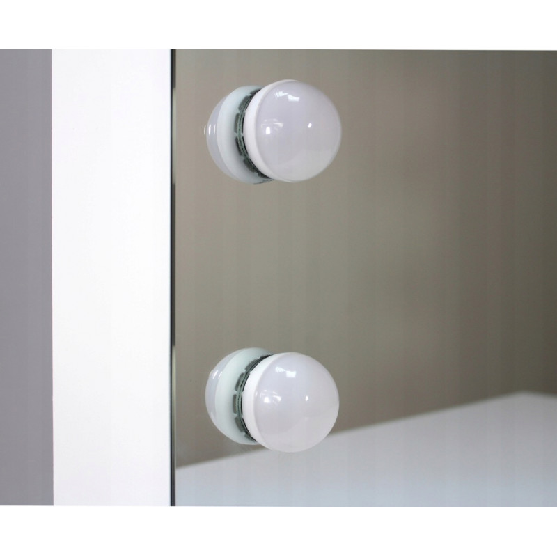 MASA DE TOALETA ALBA -HOLLYWOOD PLUS- Aceasta masuta de toaleta cu oglinda si iluminare este cu siguranta o idee de cadou excelenta pentru orice femeie. Acesta va gazdui un numar mare de coliere, inele, bratari intr-un sertar incapator. Cele 12 lumini cu leduri adauga farmec si eleganta, iar oglinda exterioara este, dupa cum toata lumea stie, un element indispensabil in orice dormitor. PARAMETRII: Oglinda mare12 becuri LEDCuloarea luminii alb cald Stil modern Facut din placi de mobilier MDFTragator spatios gradat Ambalat cu grija pentru transport.Dimensiunile prezentate in imaginea de mai jos Lungimea cablului - 150cm *Articolele prezentate in imagine (bijuterii, cosmetice) nu fac parte din masa de toaleta.