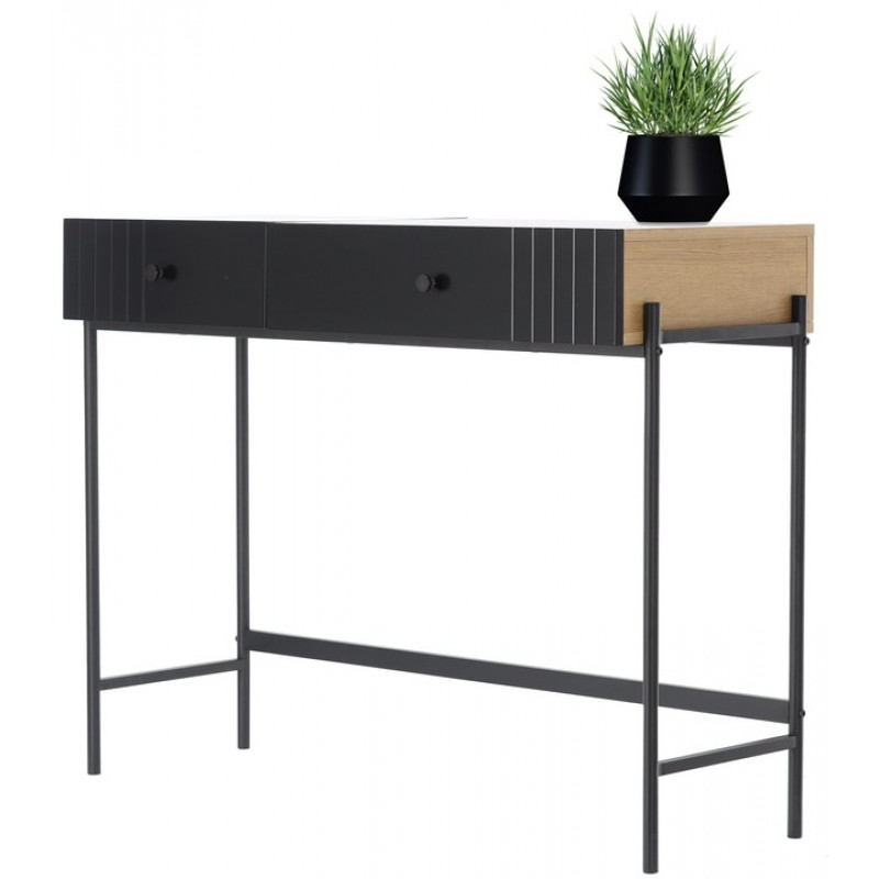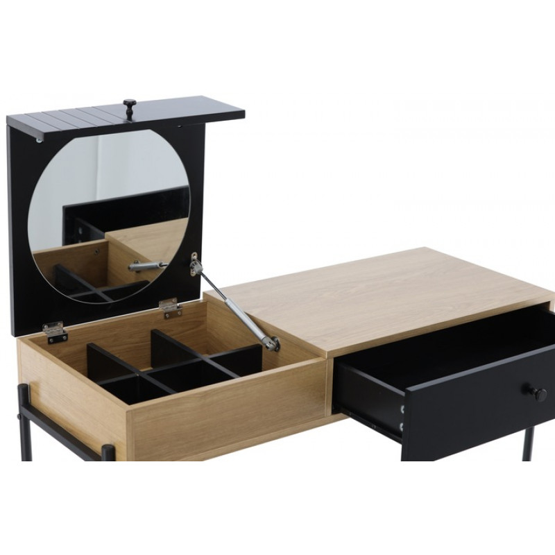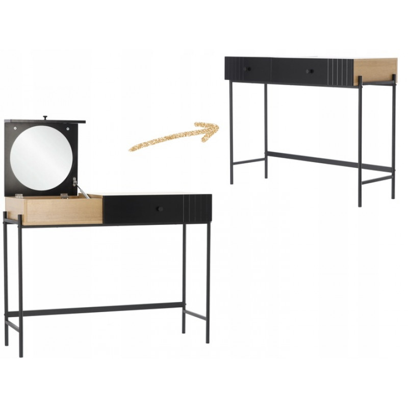 Inaltime: 79 cm Masuta de toaleta este o combinatie extraordinara de functionalitate si design unic , care cu siguranta va da spatiului dumneavoastra un caracter personal. Dotata cu o oglinda mobila, masa de toaleta devine nu doar un loc practic pentru ingrijire, ci si o consola eleganta care se adapteaza nevoilor dumneavoastra. Eleganta si functionalitate Realizata din materiale de inalta calitate, cum ar fi placi fibroase (PB), placa melaminata, metal si sticla, masa de toaleta garanteaza durabilitate si estetica. Combinatia de finisaj negru si lemn confera mobilierului un caracter retro, ceea ce il face sa se potriveasca perfect in diverse stiluri de interior. Sertare si rafturi practice Masuta de toaleta are 1 sertar in care poti depozita cosmetice, bijuterii si alte articole necesare si 1 raft . Oglinda rotunda, mobila Punctul central al mesei de toaleta este o oglinda rotunda , care adauga farmec si functionalitate. Datorita acesteia, iti poti controla aspectul din toate partile, ceea ce face ingrijirea zilnica si pregatirea pentru zi mai usoara. Consola Masuta de toaleta nu este doar un loc practic pentru ingrijire, ci si o consola eleganta care se adapteaza nevoilor dumneavoastra. Elementele de constructie din metal si detaliile din sticla fac masa de toaleta solida si usoara in acelasi timp.