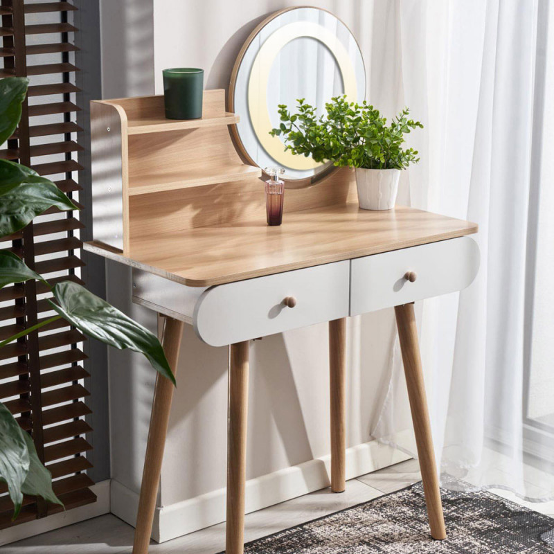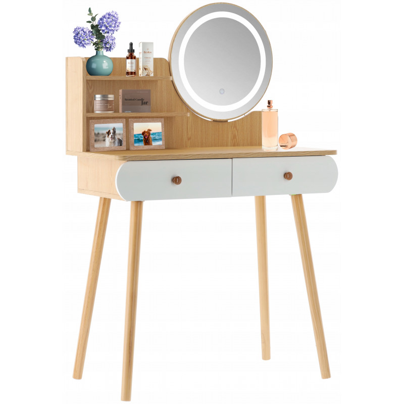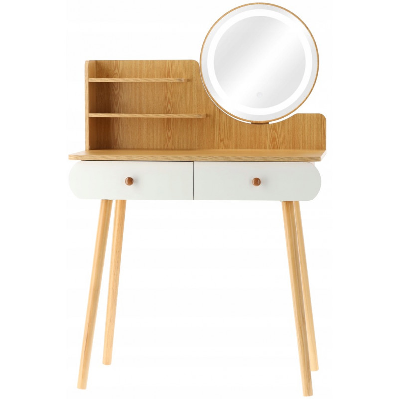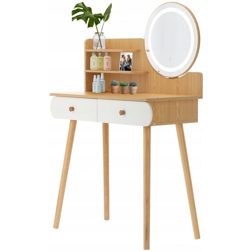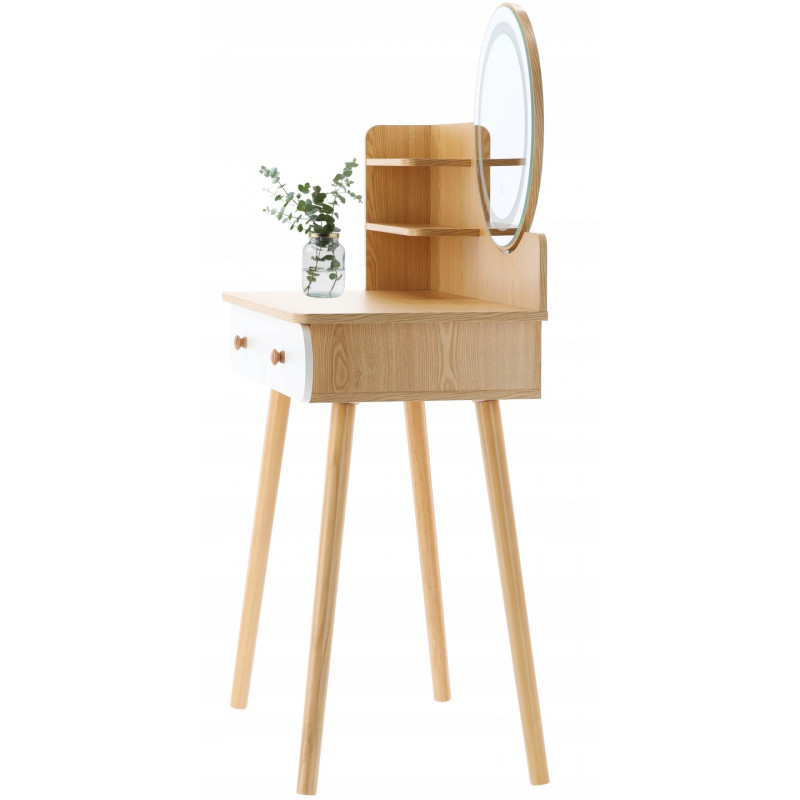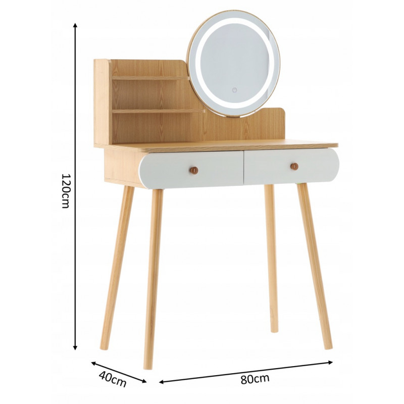Inaltime: 120cm O masa de toaleta eleganta este o solutie functionala si practica. Ne permite sa depozitam cosmeticele sau bijuteriile preferate, comoditatea utilizarii si confortul de a avea la indemana toate articolele necesare.Masuta de toaleta LED cu iluminare este o piesa de mobilier unica, care combina functionalitatea si designul modern. Masuta de toaleta este dotata cu iluminare LED incorporata care ofera o lumina puternica si uniforma, ideala pentru machiaj sau pentru a va pregati sa iesiti in oras. Datorita iluminarii cu LED, utilizatorul isi poate evalua cu exactitate aspectul si poate efectua cu precizie diverse proceduri cosmetice. Eleganta si functionalitate Designul simplu al masutei de toaleta se distinge prin simplitatea si minimalismul caracteristice stilului scandinav. Culorile luminoase, materialele naturale si formele ergonomice creeaza un ansamblu armonios. Oglinda rotunda cu LED Punctul principal al masutei de toaleta este oglinda rotunda, care adauga farmec si functionalitate. Aceasta va permite sa va controlati aspectul din toate partile, facilitand ingrijirea zilnica si pregatirea pentru zi. Lumina LED suplimentara este ideala pentru aplicarea machiajului. Sertare si rafturi practice Masuta de toaleta are 2 sertare in care puteti depozita cosmeticele, bijuteriile si alte obiecte esentiale, precum si 2 rafturi. Asamblare usoara Asamblarea masutei de toaleta este rapida si usoara, astfel incat va veti putea bucura de ea in dormitorul dvs. in cel mai scurt timp. Toate componentele necesare pentru asamblare sunt incluse, iar