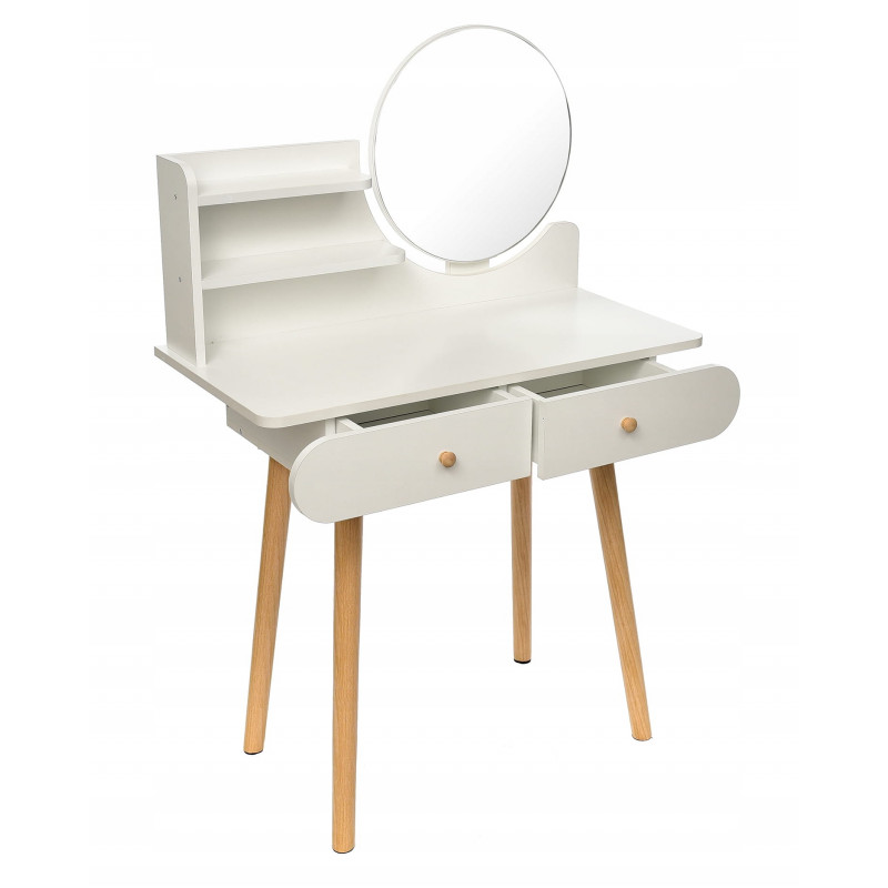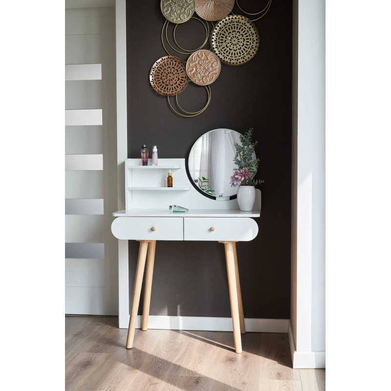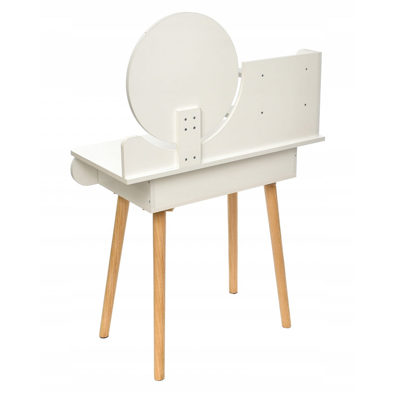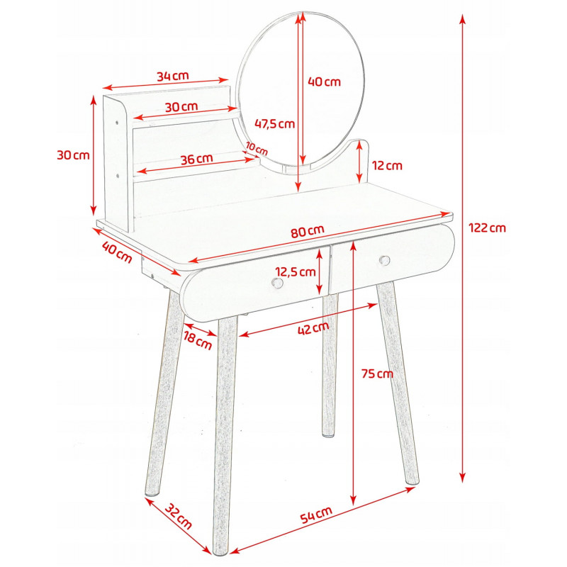 Aceasta piesa de mobilier este perfecta pentru dormitor, fiind un loc practic pentru machiaj, coafura, ingrijirea zilnica a frumusetii, precum si pentru a scrie o scrisoare sau pentru a depozita o varietate de obiecte mici. UTILIZARE OPTIMA SI PRACTICA - sertare, ideale pentru cosmetice, bijuterii, chitante, instrumente de scris si orice obiecte mici care vor avea in sfarsit locul lor,- rafturi convenabile pentru a tine obiectele folosite zilnic, cum ar fi crema de maini, un recipient de perii pentru pudra, parfum si accesorii pentru par,- o suprafata de lucru care va permite, de asemenea, sa folositi masuta de toaleta ca birou,- o oglinda, astfel incat sa va puteti vedea coafura si machiajul in detaliu din toate partile,- o zona de depozitare convenabila pentru taburete SPECIFICATIILE PRODUSULUI Material Tabla MDFCuloare alb Inaltimea mobilierului 121.5 cm Latimea mobilierului 80 cm Adancimea mobilierului 40 cm Diametrul oglinzii 40 cm Asamblare Pentru autoasamblare *Articolele prezentate in imagine (bijuterii, cosmetice) nu fac parte din masa de toaleta.