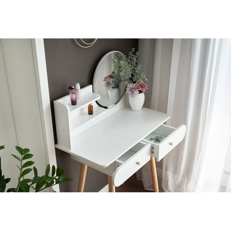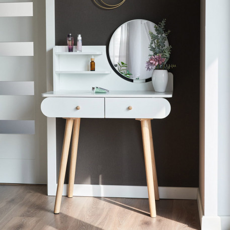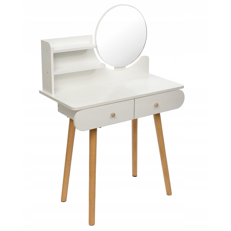 Aceasta piesa de mobilier este perfecta pentru dormitor, fiind un loc practic pentru machiaj, coafura, ingrijirea zilnica a frumusetii, precum si pentru a scrie o scrisoare sau pentru a depozita o varietate de obiecte mici. UTILIZARE OPTIMA SI PRACTICA - sertare, ideale pentru cosmetice, bijuterii, chitante, instrumente de scris si orice obiecte mici care vor avea in sfarsit locul lor,- rafturi convenabile pentru a tine obiectele folosite zilnic, cum ar fi crema de maini, un recipient de perii pentru pudra, parfum si accesorii pentru par,- o suprafata de lucru care va permite, de asemenea, sa folositi masuta de toaleta ca birou,- o oglinda, astfel incat sa va puteti vedea coafura si machiajul in detaliu din toate partile,- o zona de depozitare convenabila pentru taburete SPECIFICATIILE PRODUSULUI Material Tabla MDFCuloare alb Inaltimea mobilierului 122 cm Latimea mobilierului 80 cm Adancimea mobilierului 40 cm Diametrul oglinzii 40 cm Asamblare Pentru autoasamblare *Articolele prezentate in imagine (bijuterii, cosmetice) nu fac parte din masa de toaleta.