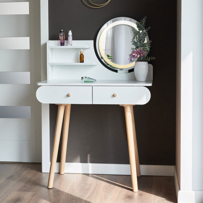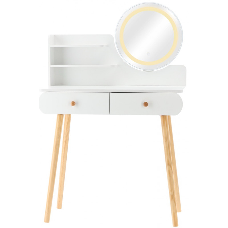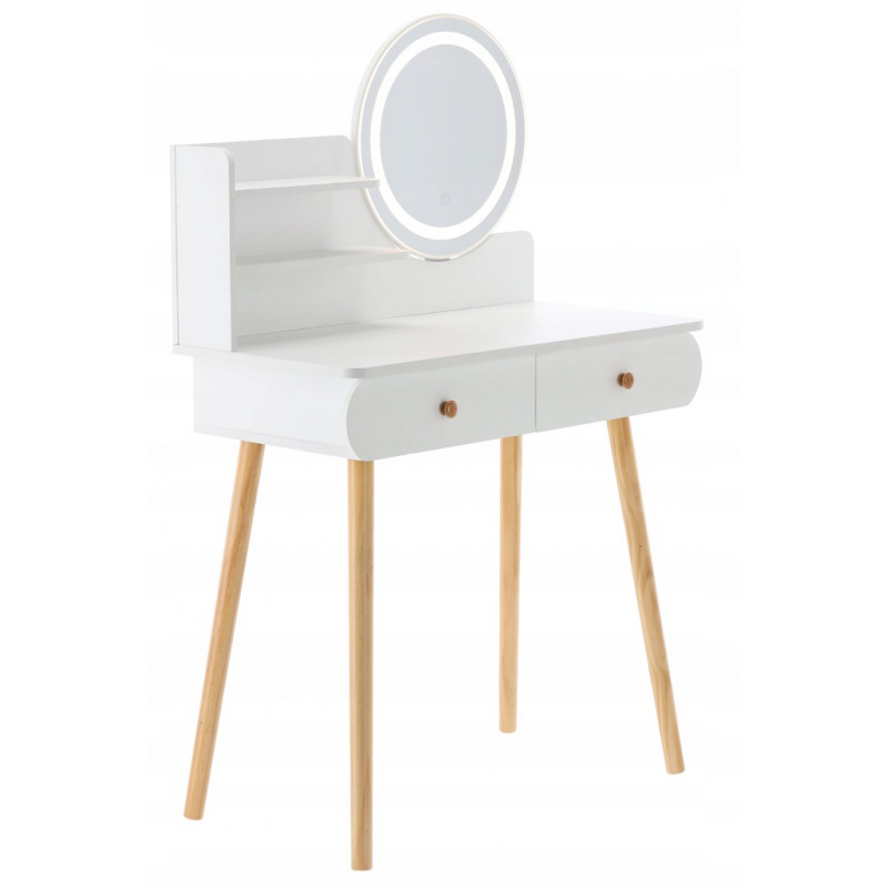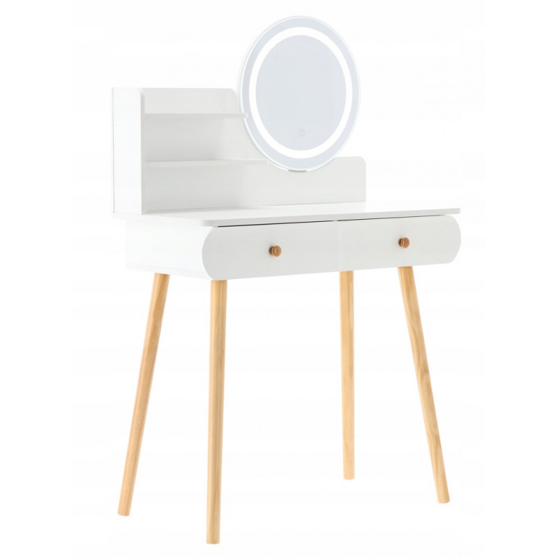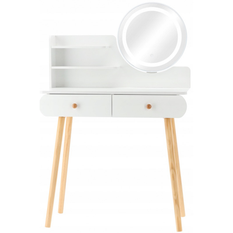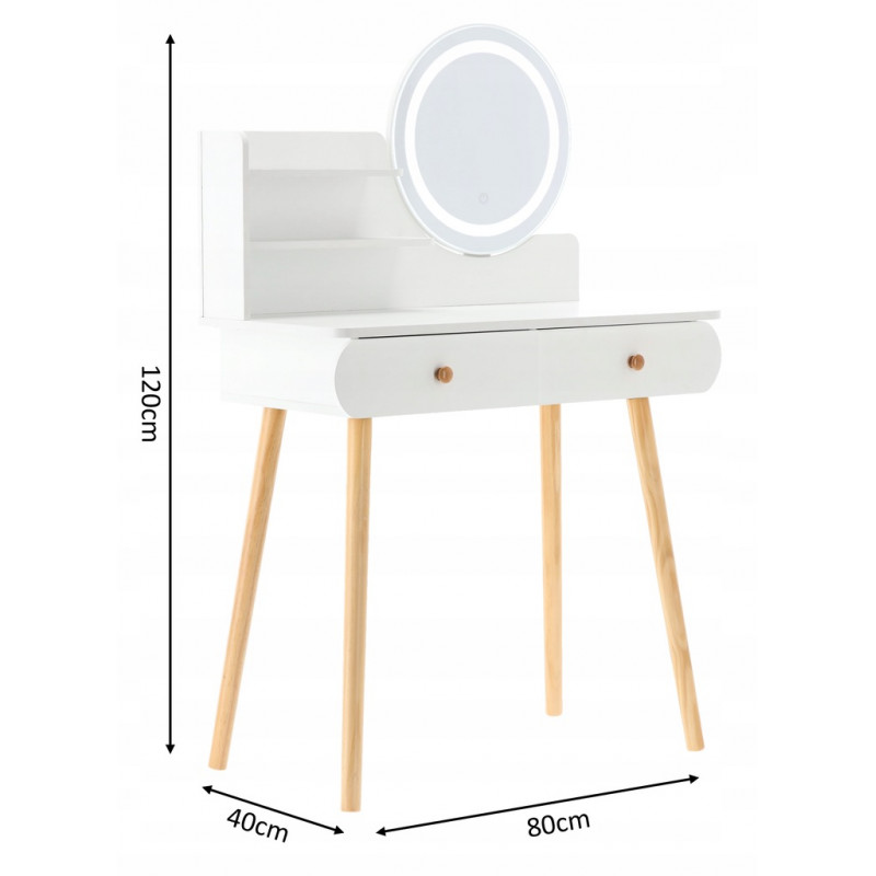 Inaltime: 120cm O masa de toaleta eleganta este o solutie functionala si practica. Ne permite sa depozitam cosmeticele sau bijuteriile preferate - o oglinda, comoditatea utilizarii si confortul de a avea la indemana toate articolele necesare.Masuta de toaleta LED cu iluminare este o piesa de mobilier unica, care combina functionalitatea si designul modern. Masuta de toaleta este dotata cu iluminare LED incorporata care ofera o lumina puternica si uniforma, ideala pentru machiaj sau pentru a va pregati sa iesiti in oras. Datorita iluminarii cu LED, utilizatorul isi poate evalua cu exactitate aspectul si poate efectua cu precizie diverse proceduri cosmetice. Eleganta si functionalitate Designul simplu al masutei de toaleta se distinge prin simplitatea si minimalismul caracteristice stilului scandinav. Culorile luminoase, materialele naturale si formele ergonomice creeaza un ansamblu armonios. Oglinda rotunda cu LED Punctul principal al masutei de toaleta este oglinda rotunda, care adauga farmec si functionalitate. Aceasta va permite sa va controlati aspectul din toate partile, facilitand ingrijirea zilnica si pregatirea pentru zi. Lumina LED suplimentara este ideala pentru aplicarea machiajului. Sertare si rafturi practice Masuta de toaleta are 2 sertare in care puteti depozita cosmeticele, bijuteriile si alte obiecte esentiale, precum si 2 rafturi. Asamblare usoara Asamblarea masutei de toaleta este rapida si usoara, astfel incat va veti putea bucura de ea in dormitorul dvs. in cel mai scurt timp. Toate componentele necesare pentru asamblare sunt incluse, iar