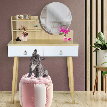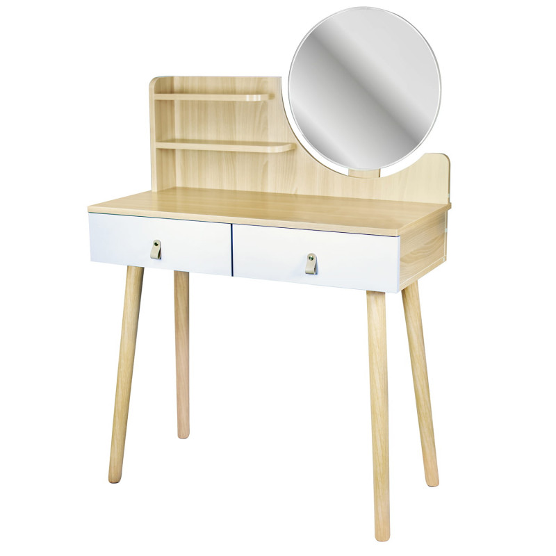 Aceasta piesa de mobilier este perfecta pentru dormitor, fiind un loc practic pentru machiaj, coafura, ingrijirea zilnica a frumusetii, precum si pentru a scrie o scrisoare sau pentru a depozita o varietate de obiecte mici. UTILIZARE OPTIMA SI PRACTICA - sertare, ideale pentru cosmetice, bijuterii, chitante, instrumente de scris si orice obiecte mici care vor avea in sfarsit locul lor,- rafturi convenabile pentru a tine obiectele folosite zilnic, cum ar fi crema de maini, un recipient de perii pentru pudra, parfum si accesorii pentru par,- o suprafata de lucru care va permite, de asemenea, sa folositi masuta de toaleta ca birou,- o oglinda, astfel incat sa va puteti vedea coafura si machiajul in detaliu din toate partile,- o zona de depozitare convenabila pentru taburete SPECIFICATIILE PRODUSULUI Material Tabla MDFCuloare alb Inaltimea mobilierului 122 cm Latimea mobilierului 80 cm Adancimea mobilierului 40 cm Diametrul oglinzii 40 cm Asamblare Pentru autoasamblare *Articolele prezentate in imagine (bijuterii, cosmetice) nu fac parte din masa de toaleta.