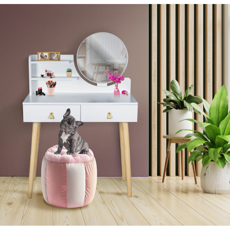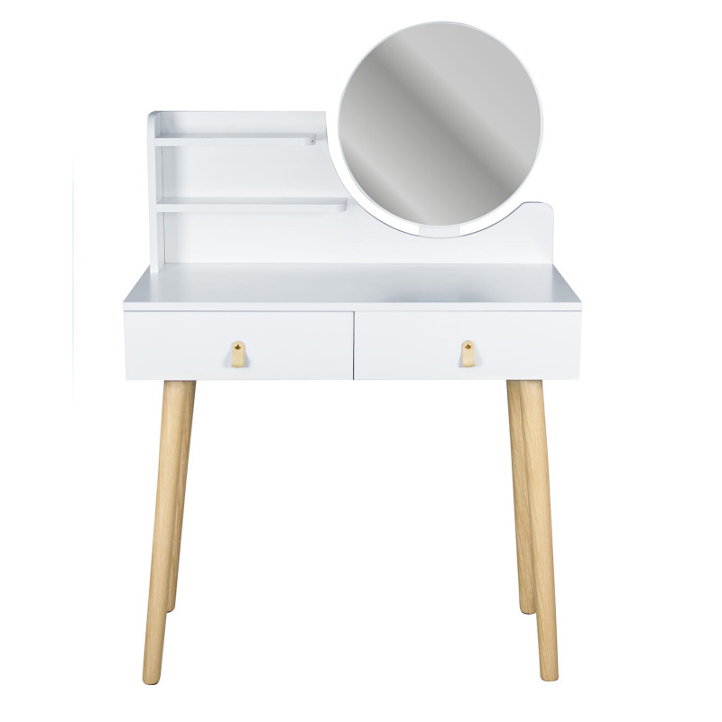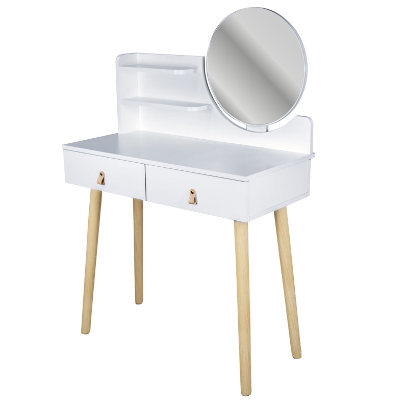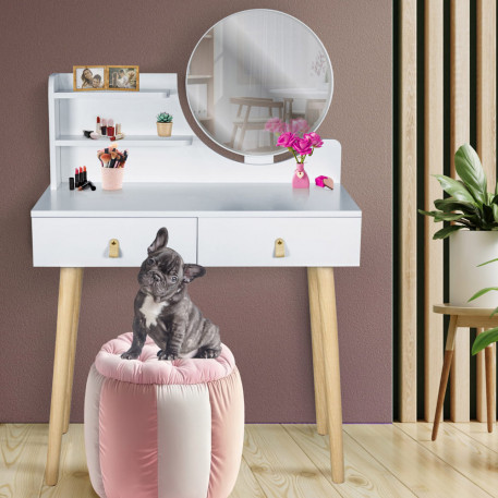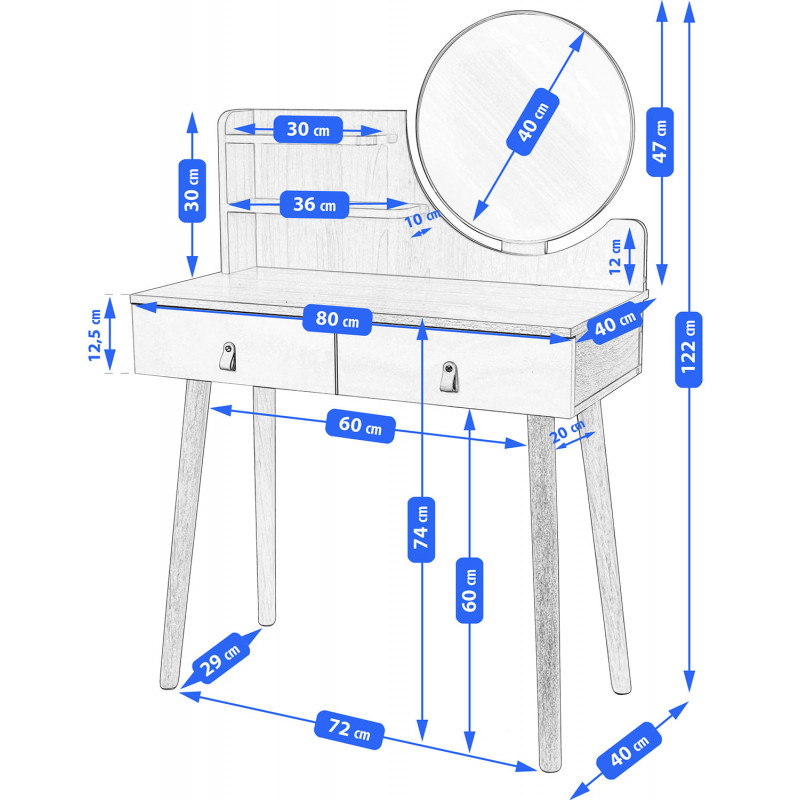 Aceasta piesa de mobilier este perfecta pentru dormitor, fiind un loc practic pentru machiaj, coafura, ingrijirea zilnica a frumusetii, precum si pentru a scrie o scrisoare sau pentru a depozita o varietate de obiecte mici. UTILIZARE OPTIMA SI PRACTICA - sertare, ideale pentru cosmetice, bijuterii, chitante, instrumente de scris si orice obiecte mici care vor avea in sfarsit locul lor,- rafturi convenabile pentru a tine obiectele folosite zilnic, cum ar fi crema de maini, un recipient de perii pentru pudra, parfum si accesorii pentru par,- o suprafata de lucru care va permite, de asemenea, sa folositi masuta de toaleta ca birou,- o oglinda, astfel incat sa va puteti vedea coafura si machiajul in detaliu din toate partile,- o zona de depozitare convenabila pentru taburete SPECIFICATIILE PRODUSULUI Material Tabla MDFCuloare alb Inaltimea mobilierului 122 cm Latimea mobilierului 80 cm Adancimea mobilierului 40 cm Diametrul oglinzii 40 cm Asamblare Pentru autoasamblare *Articolele prezentate in imagine (bijuterii, cosmetice) nu fac parte din masa de toaleta.