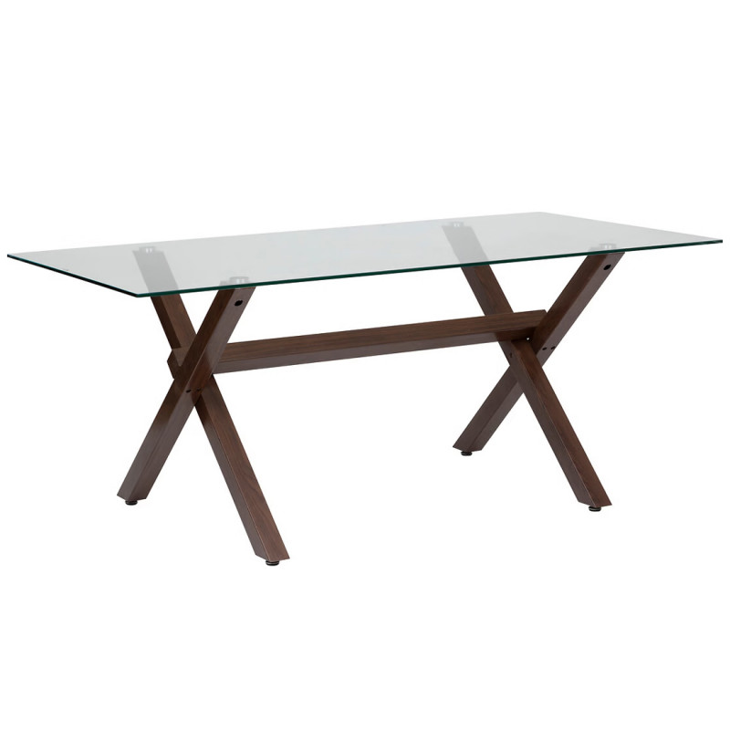 Scurta descriere Masa dining Jorel impresioneaza prin combinatia armonioasa dintre sticla transparenta si finisajul cald de nuc al picioarelor metalice. Este o piesa solida si eleganta, perfecta pentru zonele de luat masa moderne, aducand luminozitate si rafinament incaperii.