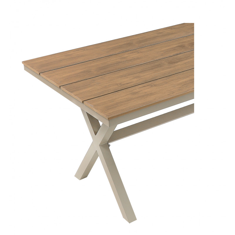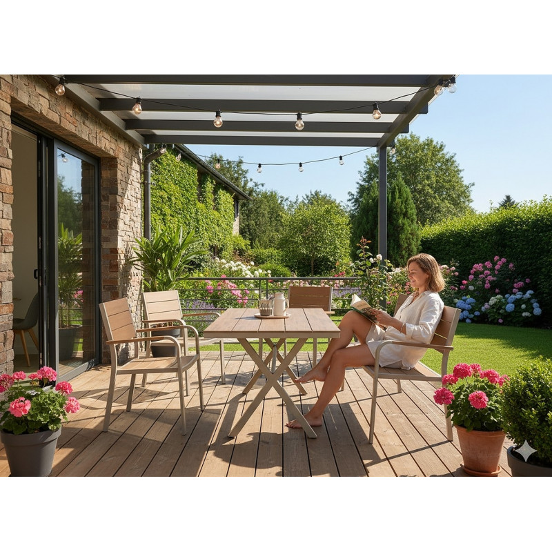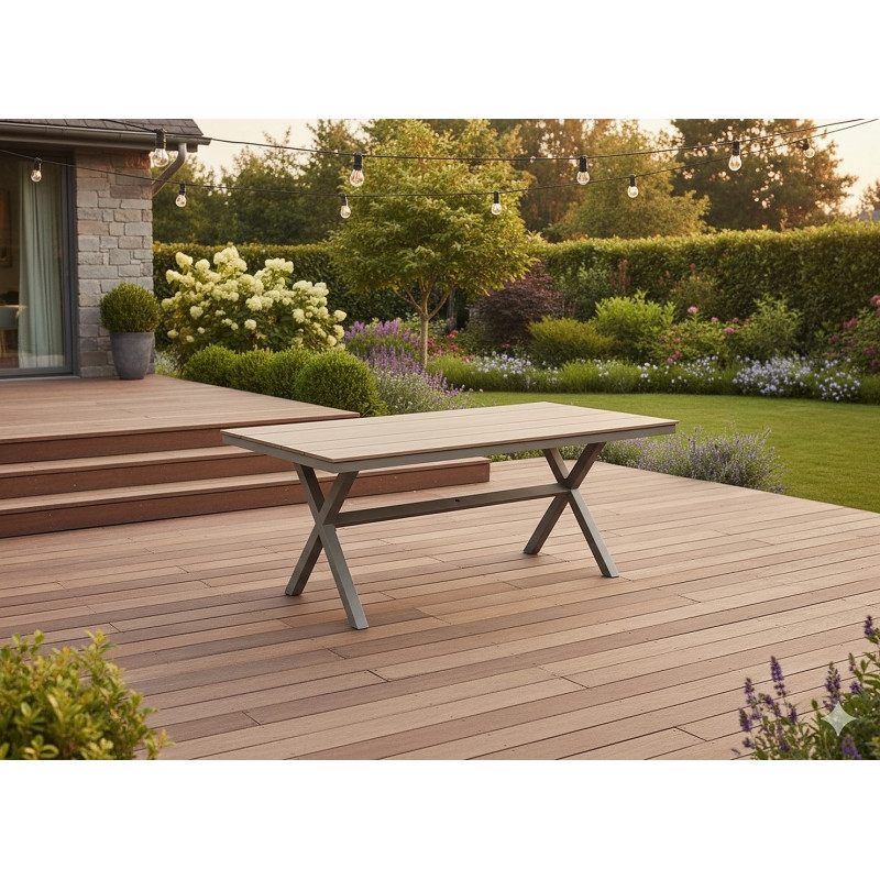 Scurta descriere Masa de gradina din aluminiu imbina designul modern cu functionalitatea si durabilitatea. Constructia usoara, dar stabila, este rezistenta la coroziune si conditii meteo, fiind ideala pentru utilizare in gradina, pe terasa sau pe patio. Blatul cu aspect de lemn ofera un design elegant si natural, fara a necesita intretinere complicata.