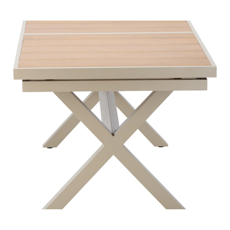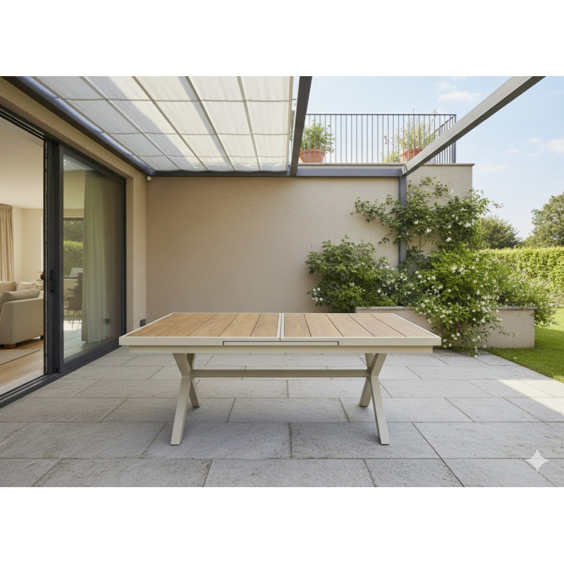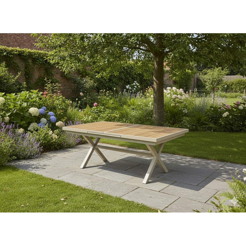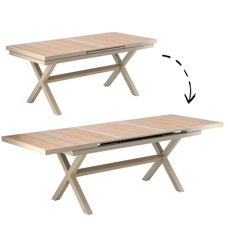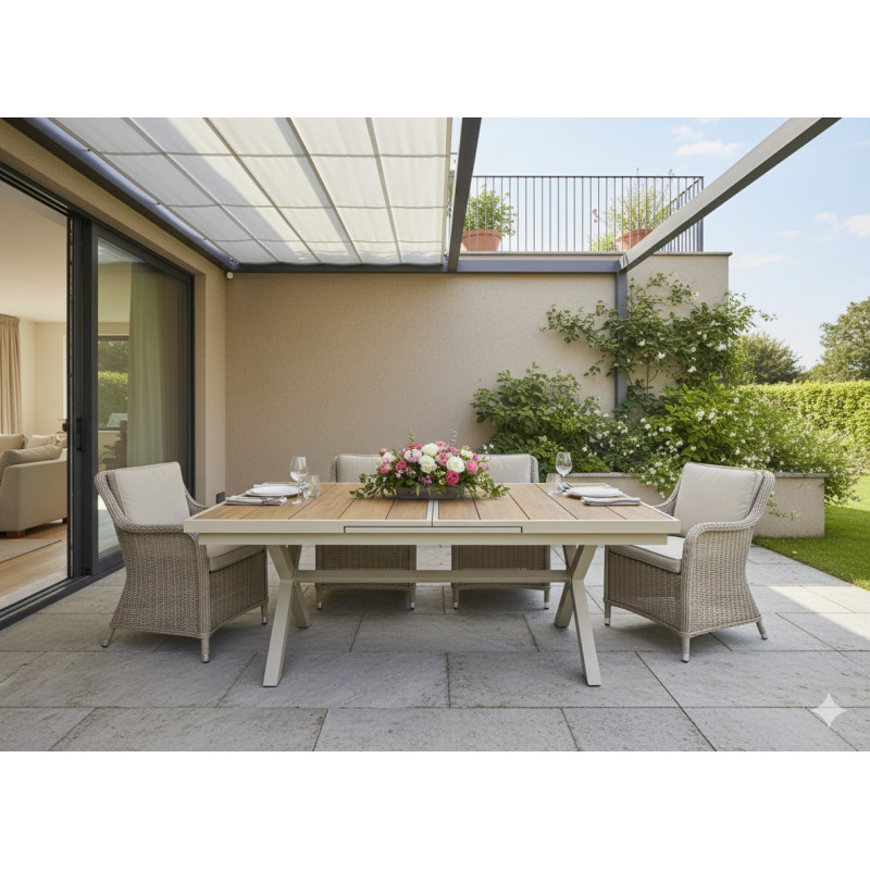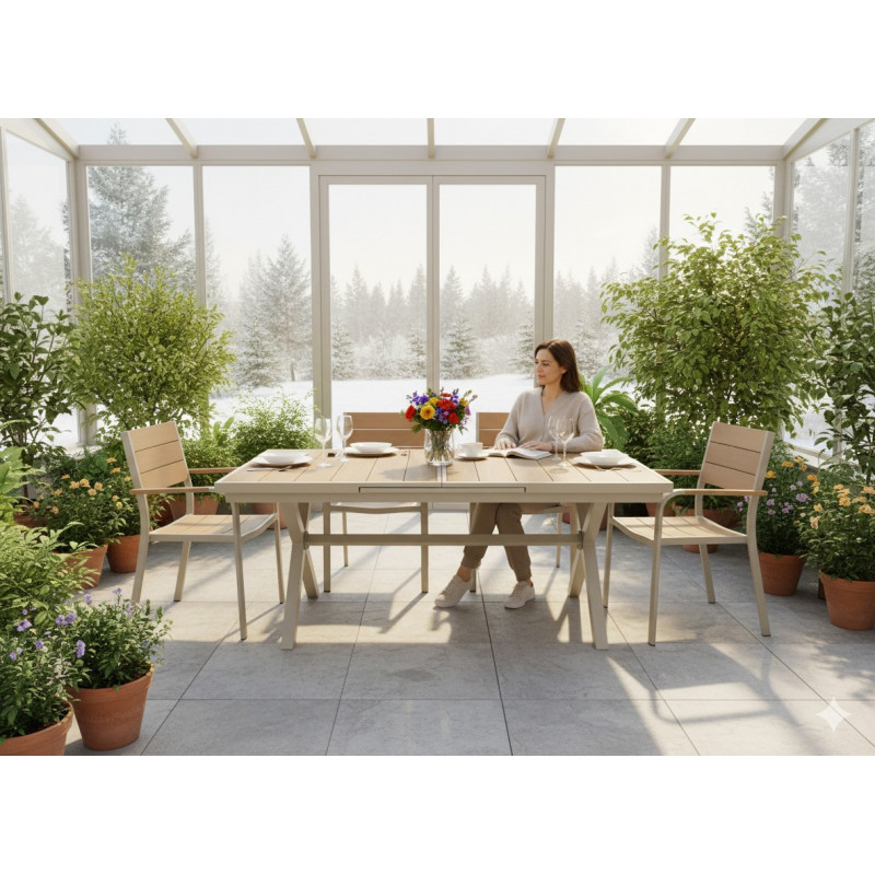 Scurta descriere Masa de gradina extensibila din aluminiu imbina designul modern cu functionalitatea si durabilitatea. Datorita sistemului de extindere, lungimea mesei poate fi ajustata de la 180 cm la 240 cm, oferind spatiu suplimentar pentru mesele in familie sau intalnirile cu prietenii. Blatul cu aspect de lemn adauga un design natural si elegant, iar cadrul din aluminiu asigura rezistenta la coroziune si conditii meteo.