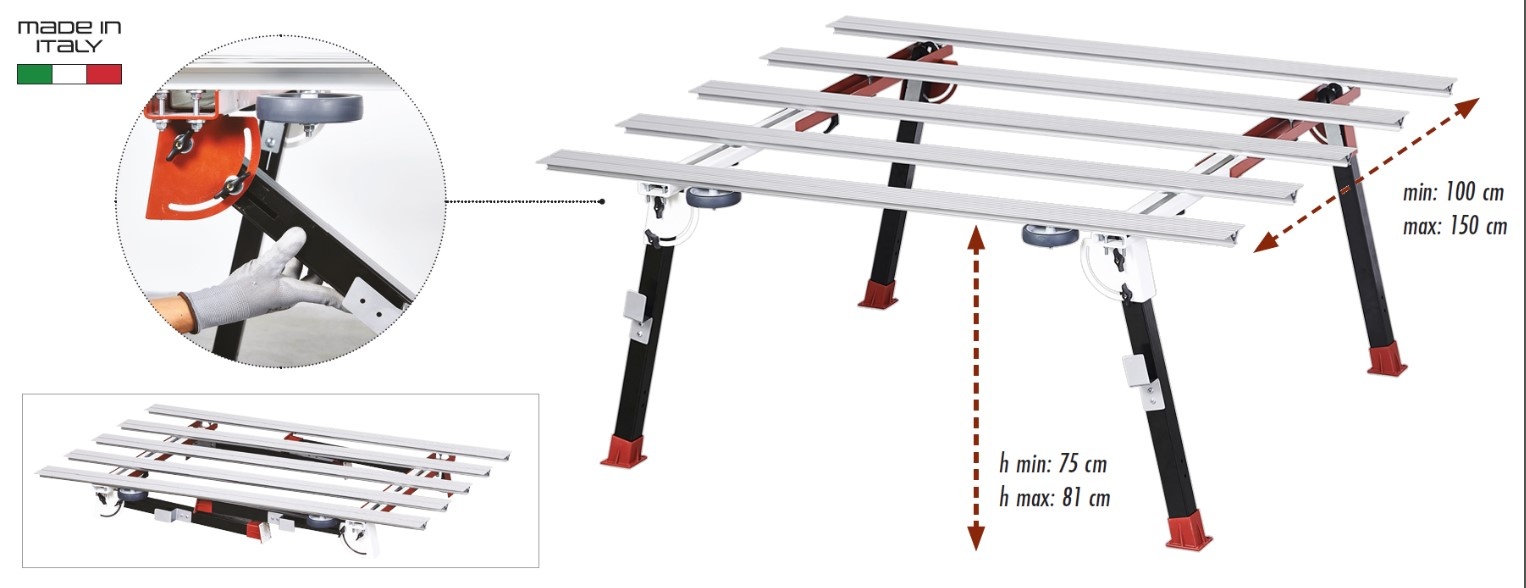 Masa de lucru Raimondi BIGFOOT XXL este o stație de lucru inovatoare și extrem de versatilă, concepută special pentru manipularea și tăierea plăcilor și dalelor de format extrem de mare, oferind o flexibilitate inegalabilă prin lățimea sa variabilă. Oferă o platformă robustă și adaptabilă pentru cele mai provocatoare proiecte de placare, asigurând stabilitate și precizie pentru materialele supradimensionate. Blatul său impresionant de lucru măsoară 180 cm (5.9') în lungime și dispune de o lățime variabilă de la 100 la 150 cm (3.3' la 4.9').