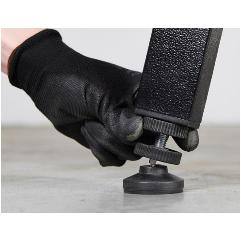 Prin rotirea piulitei inferioare reglați înălțimea (nu este nevoie de unealtă), prin strângerea piuliței superioare blocați piciorul în poziția dorită.
