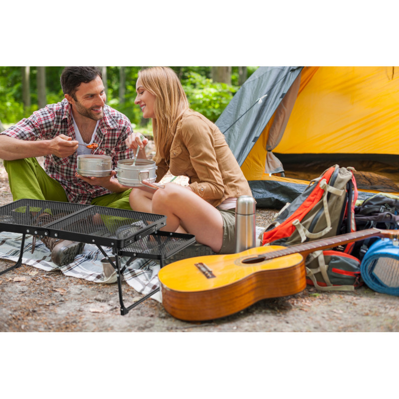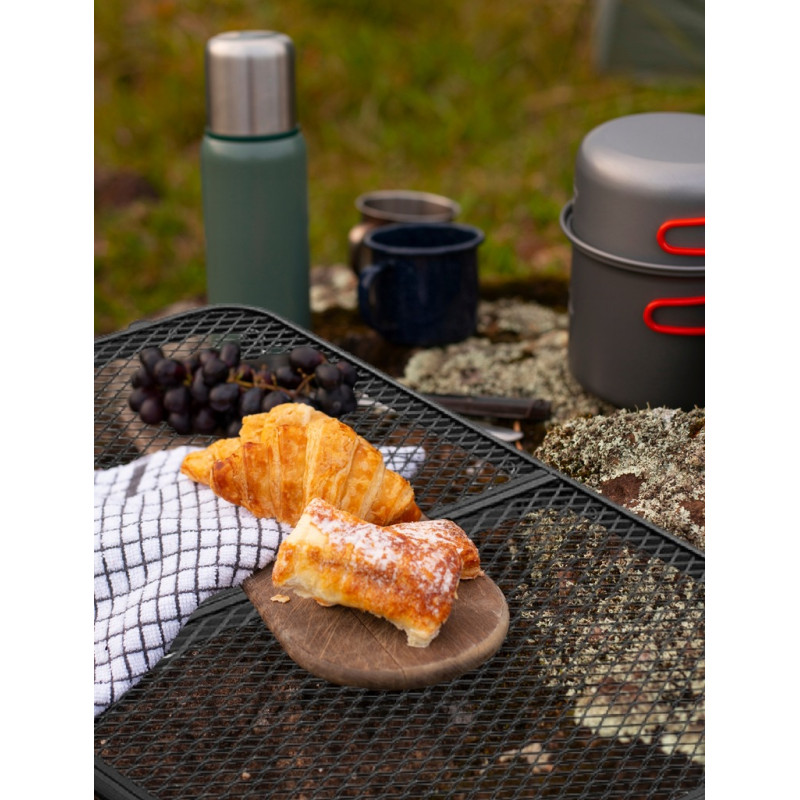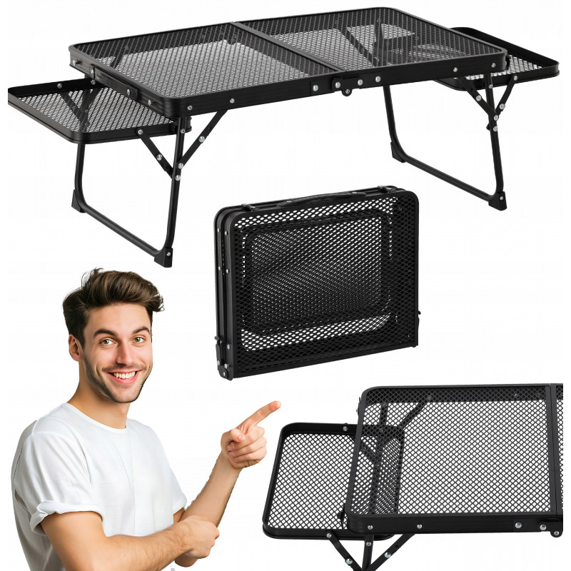 Material: otel + aluminiu Masa este realizata din otel de inalta calitate, ceea ce ii garanteaza durabilitatea si stabilitatea. In plus, rafturile superioare si laterale din otel asigura o rezistenta adecvata la sarcina. Structura pliabila face ca masa sa fie extrem de practica. Daca este necesar, poate fi pliat si depozitat rapid, ocupand spatiu minim. Perfect nu numai pentru camping sau picnicuri, ci si pentru excursii cu bicicleta, plaja sau ca spatiu suplimentar in timpul unui gratar in gradina. Aceasta masa va va oferi o suprafata confortabila in orice situatie!Datorita greutatii sale reduse, puteti lua aceasta masa cu dvs. oriunde ati merge. Perfect pentru persoanele active care apreciaza mobilitatea si confortul.