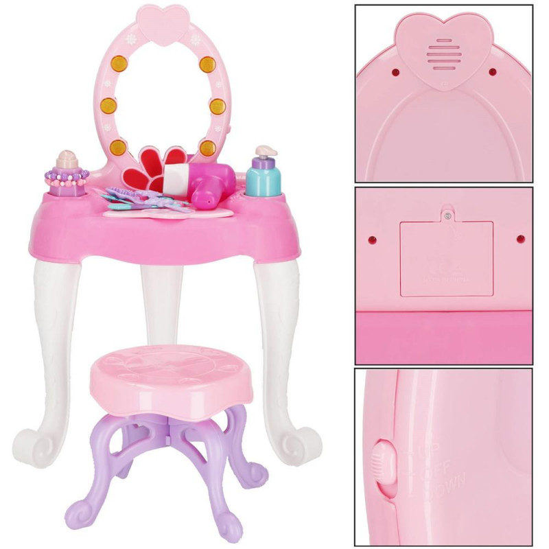 Stimularea creativitatii Setul nu include doar o masuta de toaleta eleganta cu o oglinda, ci si tot ce ai nevoie pentru o experienta de joc completa. Un taburet, o jucarie draguta tip uscator de par, bratari, agrafe de par, o perie si recipiente - toate intr-un set magic! O masa de toaleta pentru fete nu este doar un loc de joaca, ci si o lume magica a sunetelor! Cu un sistem de sunet incorporat, atunci cand sunt introduse doua recipiente, masuta de toaleta va incepe sa cante melodii fermecatoare, adaugand mai multa distractie jocului.