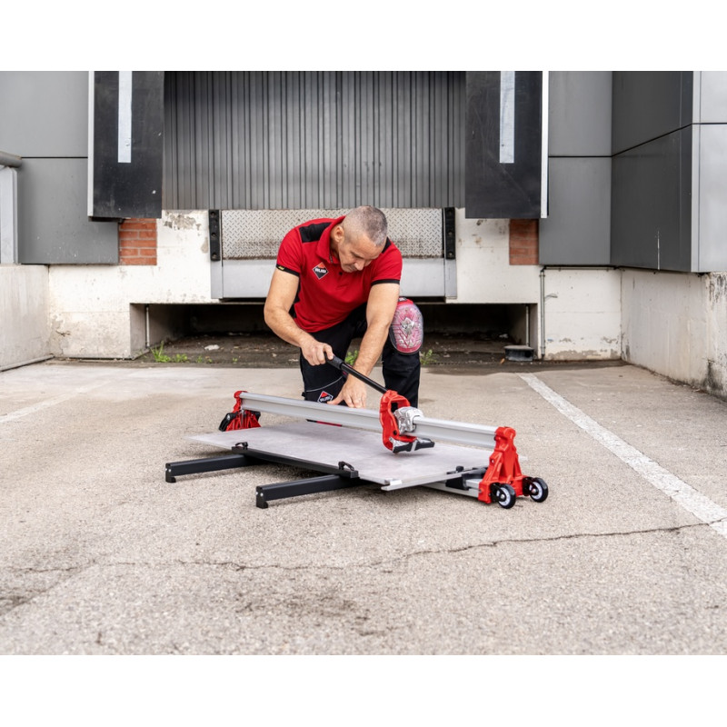 Taietor manual de plăci, puternic, cu o singură șină, cu vizibilitate excelentă a punctajului, pentru plăci de format mare. Potrivit pentru tăierea porțelanului (până la 18 mm grosime) și a altor materiale dure.