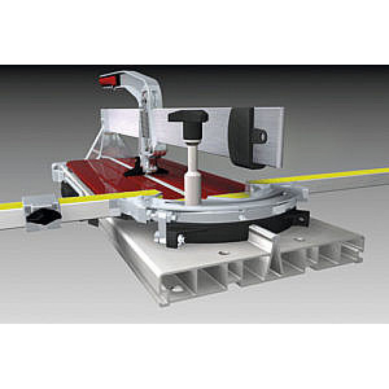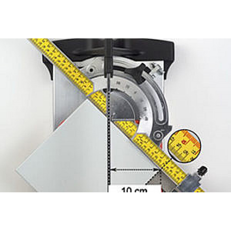 Echer gradat care poate fi rotit in ambele directii pentru taieri in unghi precise (-45° la 0 la +45°). Rigla gradata pe echerul gradat, pt. taieri drepte.
