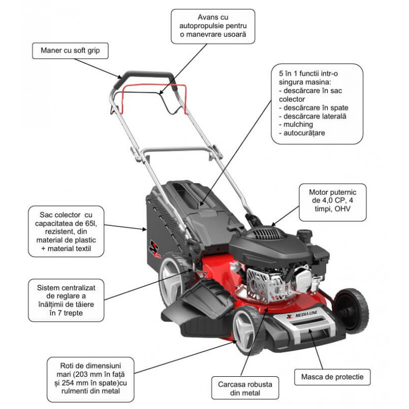 Masina de taiere gazon cu 5 functii Media Line model MG 51-173 S cu latime de taiere de 51 cm si avans cu autopropulsie