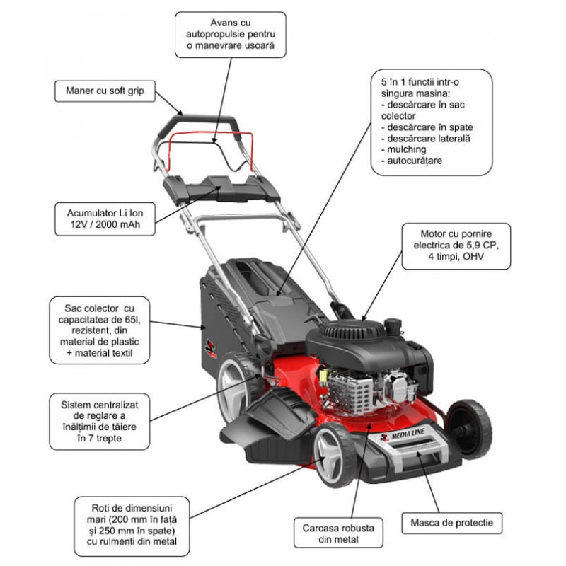 Masina de taiere gazon cu 5 functii Media Line model MG 53-224 SE cu latime de taiere de 53 cm, avans cu autopropulsie si pornire electrica