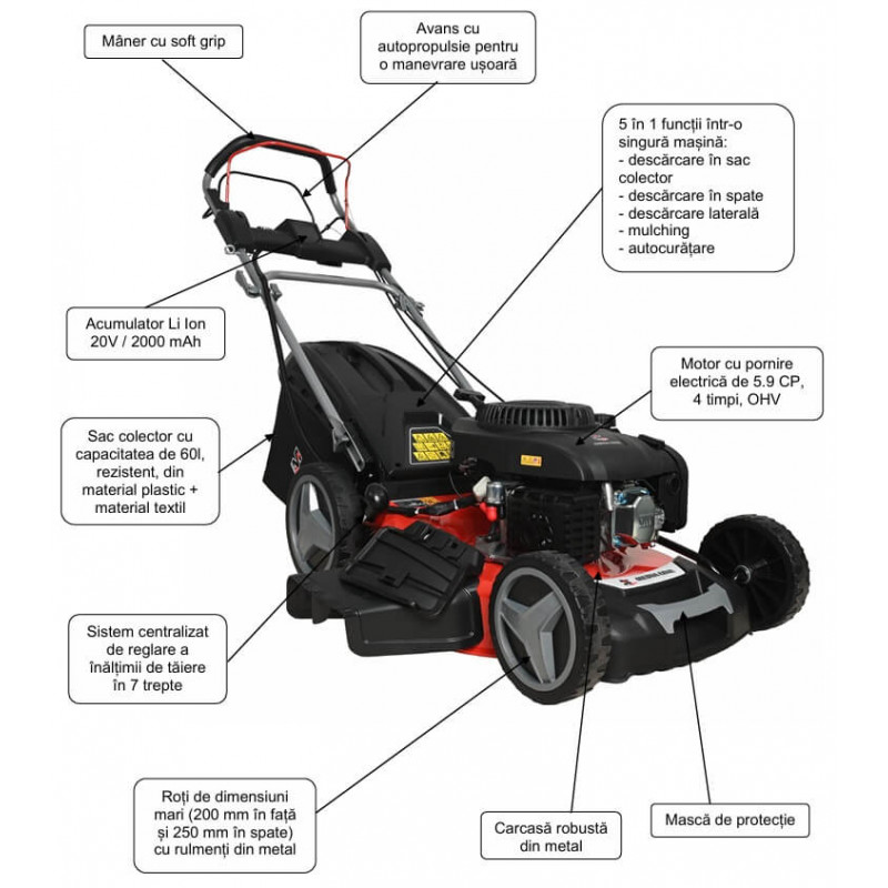 Masina de taiere gazon cu 5 functii Media Line model MG 56-224 SE cu latime de taiere de 56 cm, avans cu autopropulsie si pornire electrica