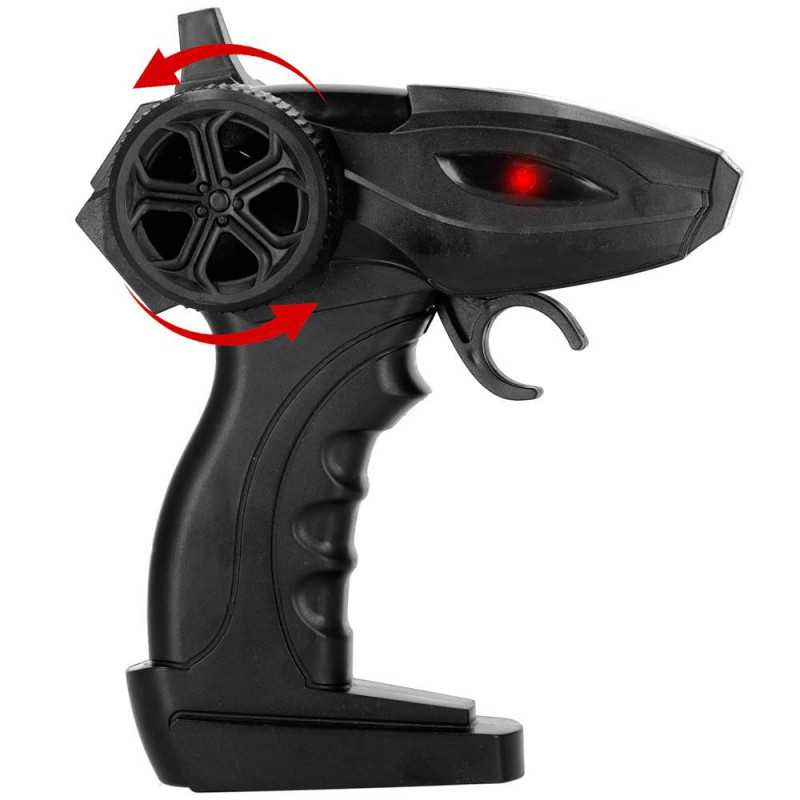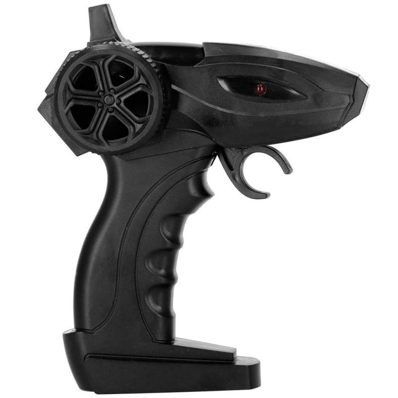 Telecomanda este echipata cu un comutator de pornire si oprire, intrari pentru baterie, o roata care controleaza traseul de conducere (dreapta/stanga), un controler de conducere (fata/spate) si o dioda rosie care indica puterea