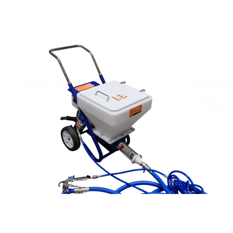Gata de utilizare: Concepută pentru a scurta perioada de construcție și a necesita mai puțini muncitori comparativ cu aplicarea manuală, pompa vine livrată cu accesoriile standard, furtun material 5m, furtun aer 10m, pistol complet cu duze, fiind gata de lucru, necesita doar un compresor de aer cu capacitate de 550-900 L / min.