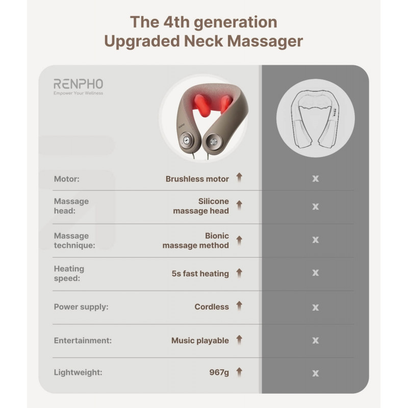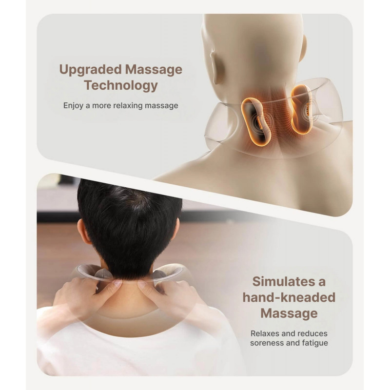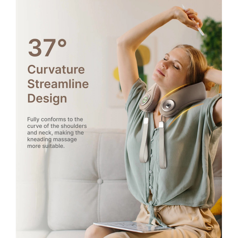Designul ergonomic, cu un unghi de 37°, se adaptează perfect formei gâtului și umerilor, mărind suprafața de masaj cu 48% și oferind o frământare eficientă a mușchilor trapez.