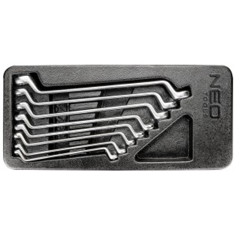 Set de chei inelare indoite Neo (nr ref. 84-233) contine 8 cheie cu dimensiuni diferite (de la 6 pana la 22 mm), realizate conform normei DIN 838. Oselul crom-vanadiu de inalta calitate asigura o durabilitate pe termen lung a cheilor. Uneltele sunt furnizate intr-un ambalaj din material plastic practic, potrivit pentru sertarul de scule Neo 84-221 si 84-222. Fiabilitatea produsului o confirma garantia de 25 de ani. Marca Neo indeplineste asteptarile profesionistilor.