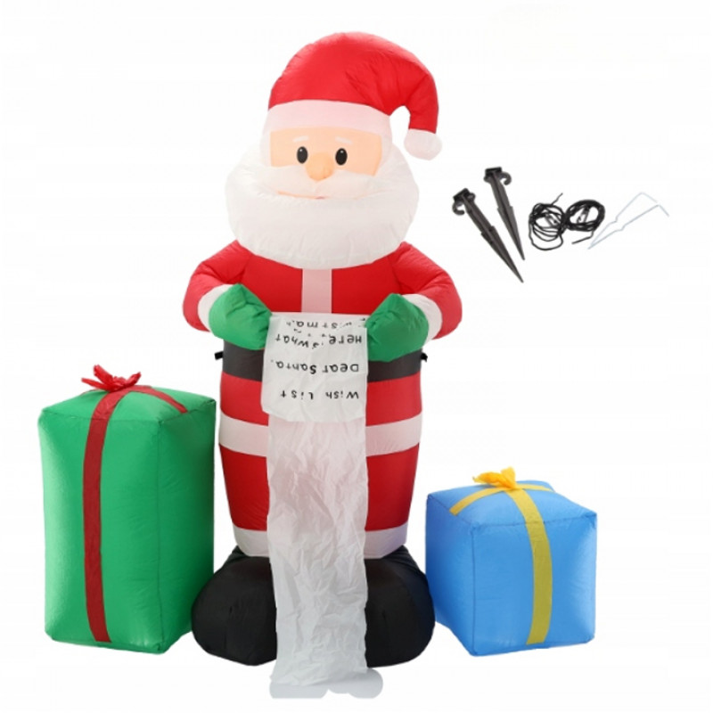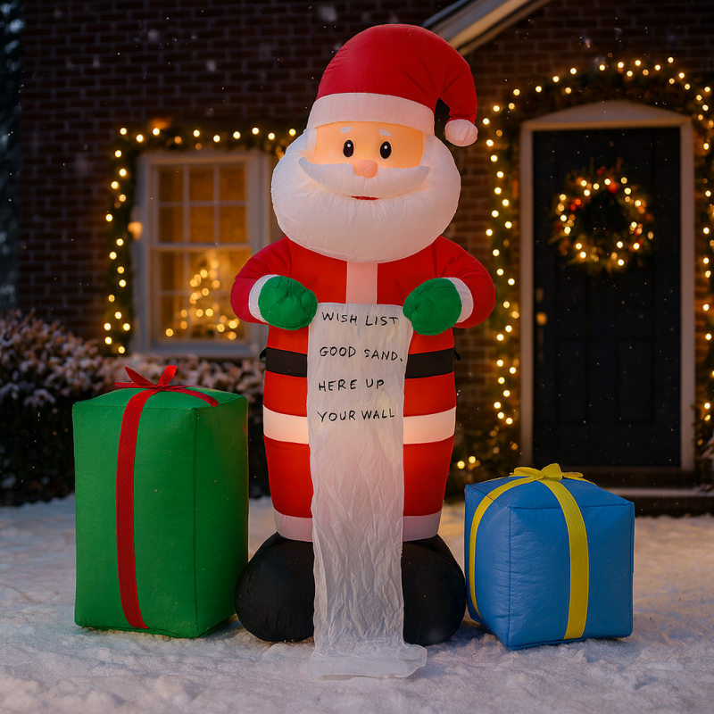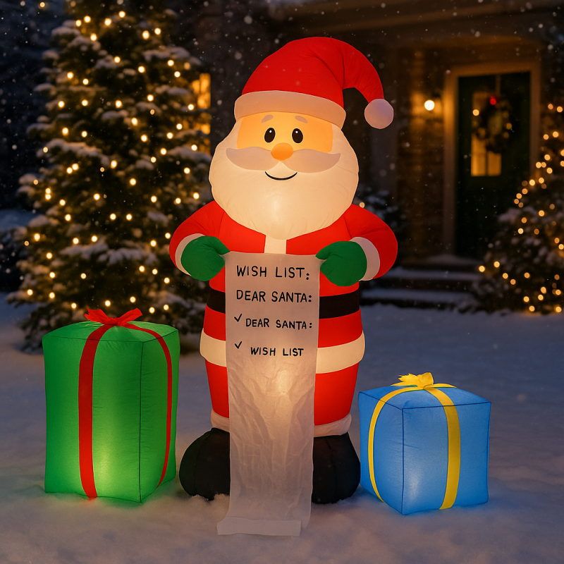 Scurta descriere Mos Craciun gonflabil cu cadouri si lista, iluminat cu LED, ideal pentru decorurile de Craciun in gradina, curte, terasa sau interior. Se umfla automat in aproximativ 1,5 minute, iar protectia IP44 il face potrivit pentru utilizare in exterior.