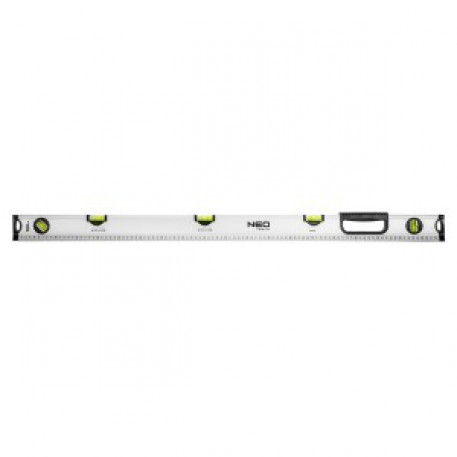 Nivel special cu bula de aer 100 cm, 5 fiole, diferite unghiuri 71-124 de la marca NEO este un instrument pentru profesionisti cu pana la 5 fiole. Va permite sa masurati unghiuri: 0°, 1,5°, 3,5°, 45°, 90°. Nivelul cu bula de aer are o lungime de 100 cm, o latime de 3 cm si o inaltime de 6 cm. Precizia sa este specificata ca fiind de ±0,5 mm/m. Manerul confortabil si scara metrica de pe ambele parti ale uneltei faciliteaza munca. Este recomandat, printre altele, pentru masurarea pantelor in conductele de canalizare sau in pavele.