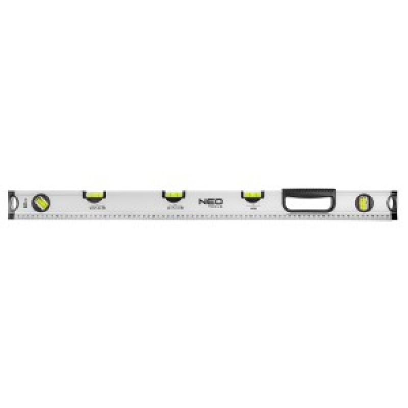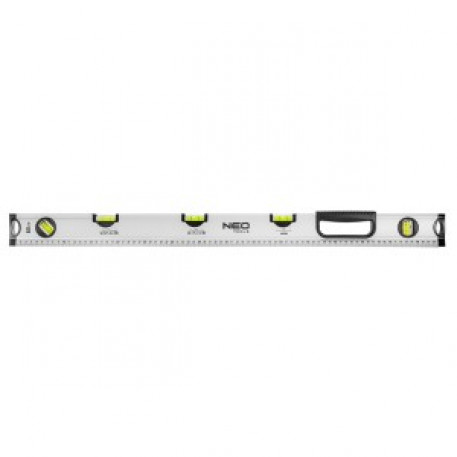 Nivelul special cu bula de aer 80 cm, 5 fiole, diferite unghiuri 71-123 de la marca NEO este un instrument pentru profesionisti cu pana la 5 fiole. Va permite sa masurati unghiuri: 0°, 1,5°, 3,5°, 45°, 90°. Nivelul cu bula de aer are o lungime de 80 cm, o latime de 3 cm. Precizia sa este specificata ca fiind de ±0,5 mm/m. Manerul confortabil si scara metrica de pe ambele parti ale uneltei faciliteaza lucrul. Este recomandat, printre altele, pentru masurarea pantelor in conductele de canalizare sau in pavele.