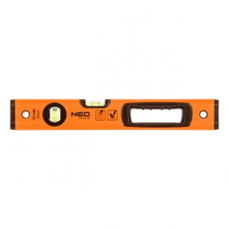 Nivela cu bula de aer din aluminiu S 400, 2 fiole, maner, 40 cm 71-141 de la NEO TOOLS este un instrument de masurare de inalta calitate cu doua fiole tubulare incorporate, care utilizeaza forta gravitatiei terestre pentru a determina unghiurile orizontale, verticale sau alte unghiuri ale planurilor in constructii. Modelul oferit are o grosime a profilului de 1,2 mm. Precizia nivelului este stabilita la 0,029°=0,5 mm/m. Instrumentul este fabricat din aluminiu usor, dar durabil. Modelul este echipat cu 2 capace anti-soc si capete cauciucate. Manerul confortabil sta bine in maini. Nivela NEO TOOLS recomandata profesionistilor si pasionatilor de bricolaj.