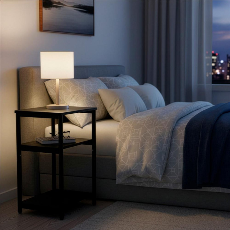 Scurta descriere: Noptiera compacta cu 3 rafturi, potrivita pentru organizarea eficienta a spatiului din dormitor. Structura metalica asigura stabilitate, iar rafturile din PAL ofera suport solid pentru obiecte personale, carti sau lampa de veghe.
