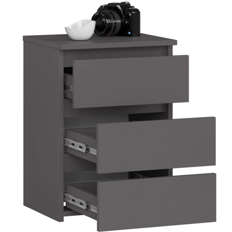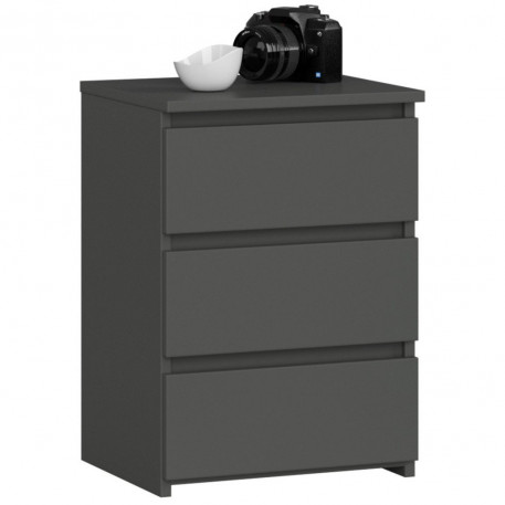 Scurta descriere Comoda compacta cu 3 sertare in nuanta moderna de grafit, realizata din PAL laminat de 16 mm, rezistent la zgarieturi si uzura. Designul simplu si elegant o face potrivita pentru dormitoare contemporane, birouri sau camere de tineret.