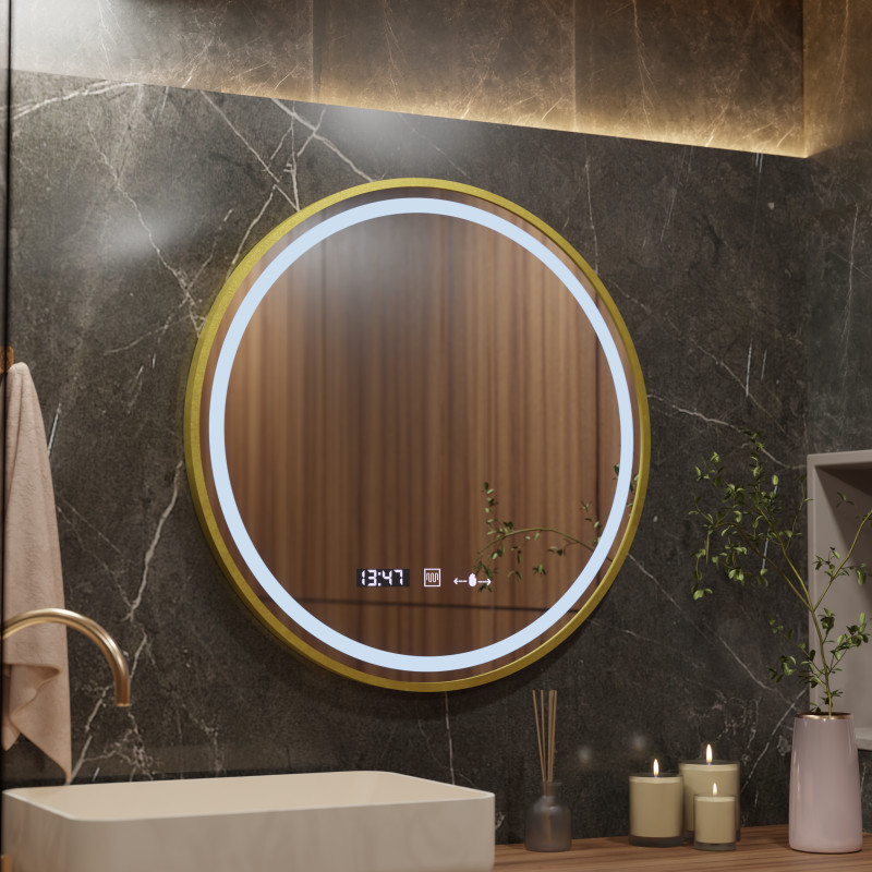 Aceasta oglinda LED rotunda, cu accente aurii, imbina perfect estetica rafinata cu functionalitatea inteligenta, transformand baia intr-un spatiu elegant si confortabil.